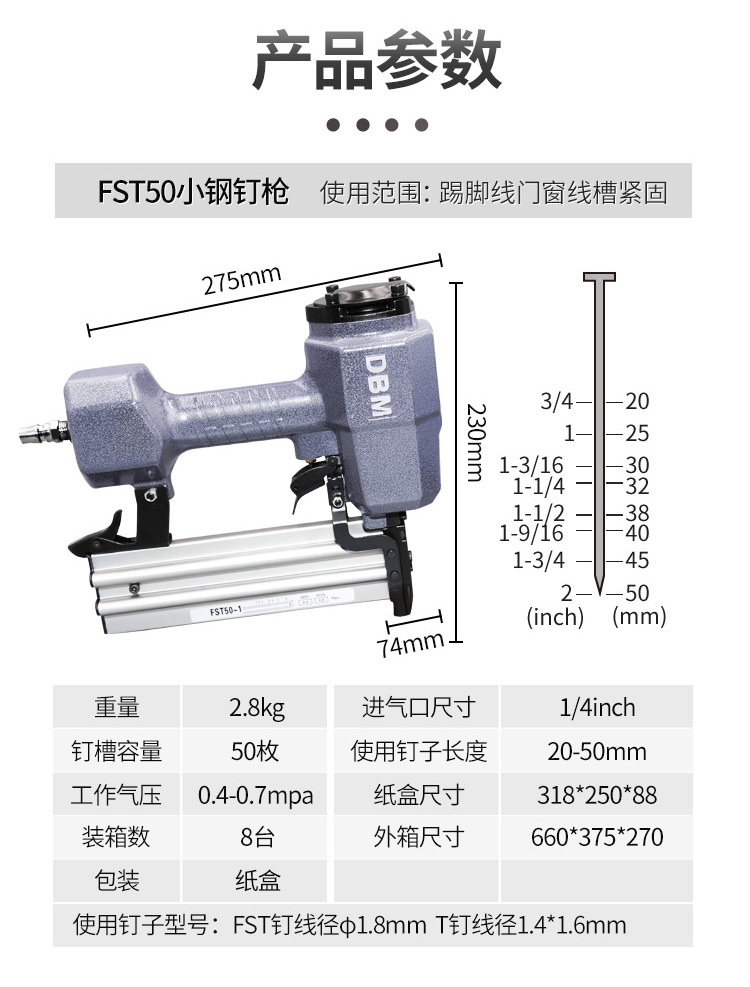 Meixin MEX DBM 소형 강철 못 총 FST50 스커트 도어 및 창 고정 못 총 머리없는 못
