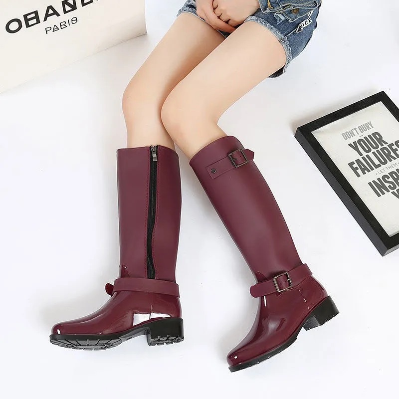 긴 장화 여성 지퍼 높은 물 신발 기모 따뜻한 성인 패션 레인 부츠 미끄럼 방지 물 부츠 방수 신발 고무 신발
