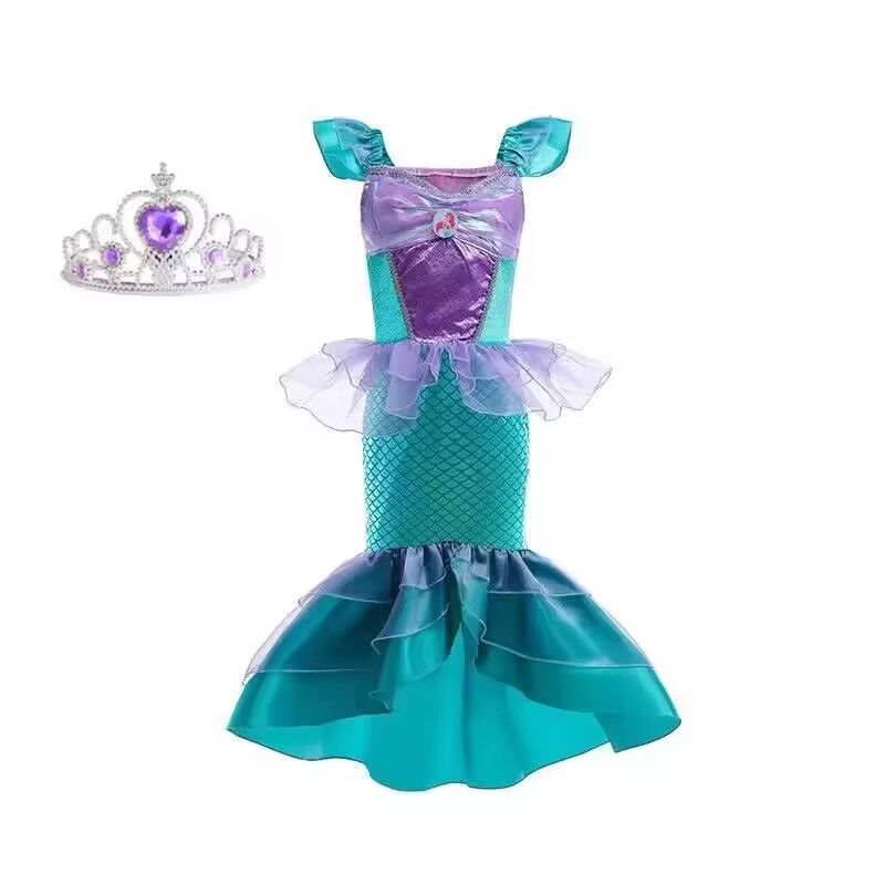 • 인어 보라색과 녹색 공주 드레스 + 무료 왕관