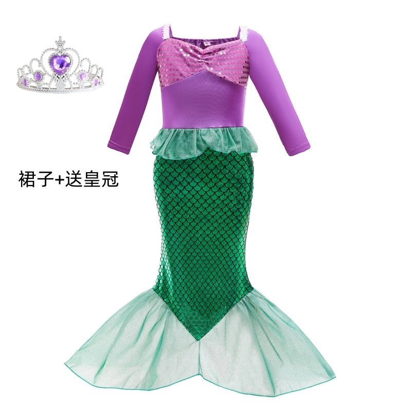 • 인어 보라색 녹색 긴팔 공주 드레스 + 무료 왕관