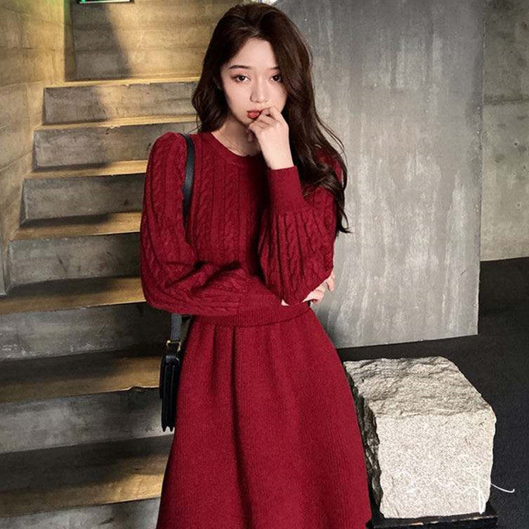 니트 원피스 여성용 2025 가을 겨울 신상 한국 스타일 허리 조임 새해 원피스 라운드넥 베이스 레이어 트위스트 스웨터 원피스스토어 가기
