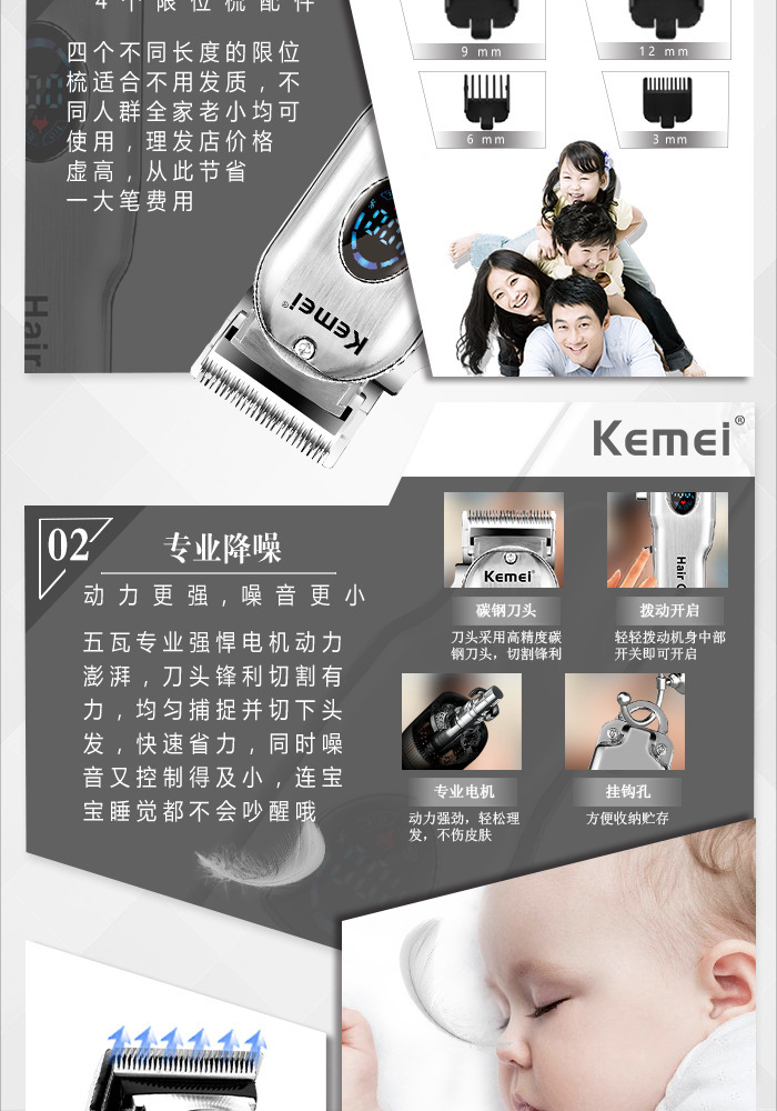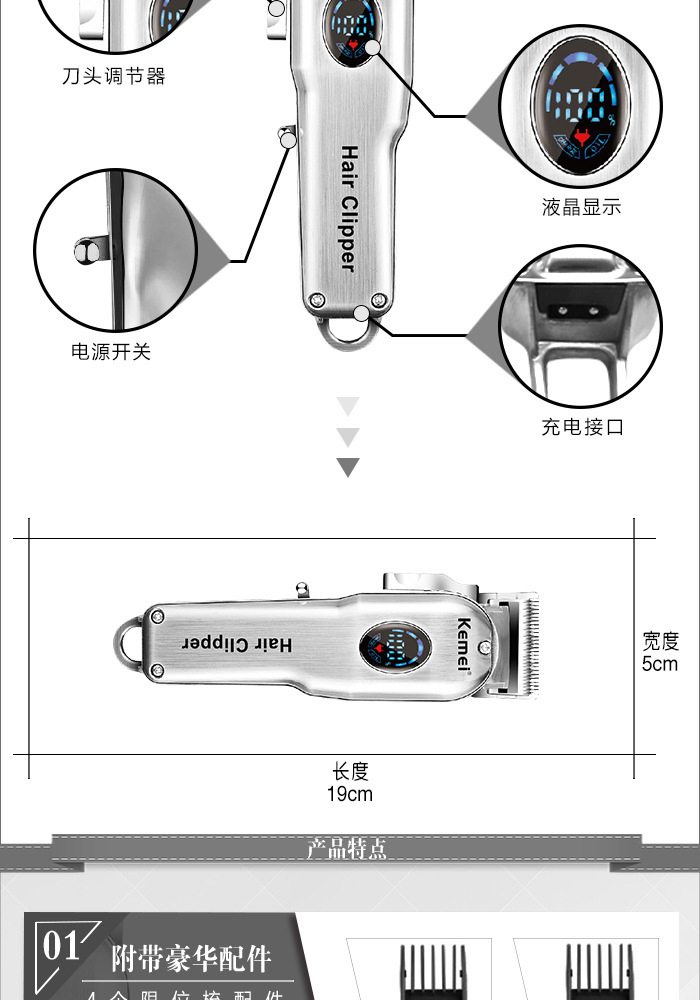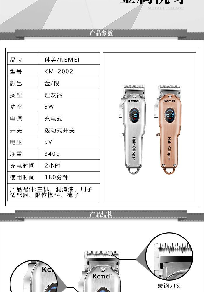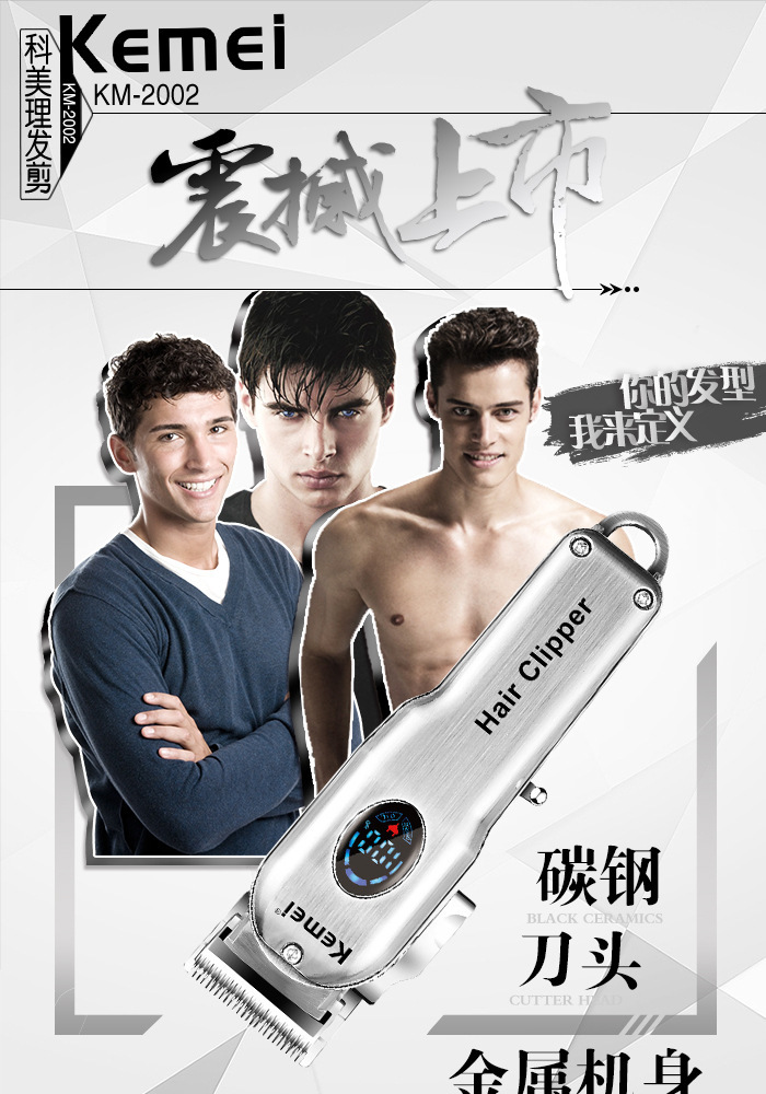 Kemei KM-2002 금속 바디 탄소 스틸 커터 헤드 조정 가능한 커터 헤드 충전식 전기 클리퍼
