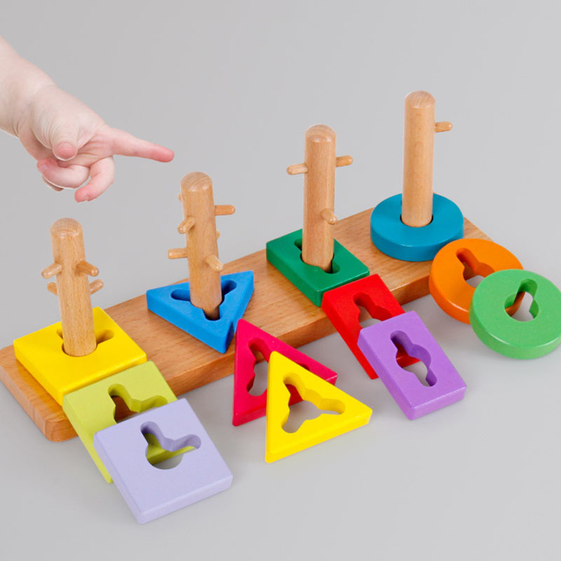 나무 기하학적 기둥 매칭 빌딩 블록 이순신 지혜 낙하 방지 잠금 해제 메커니즘 네 기둥 장난감 너도밤 나무 교육 보조스토어 가기