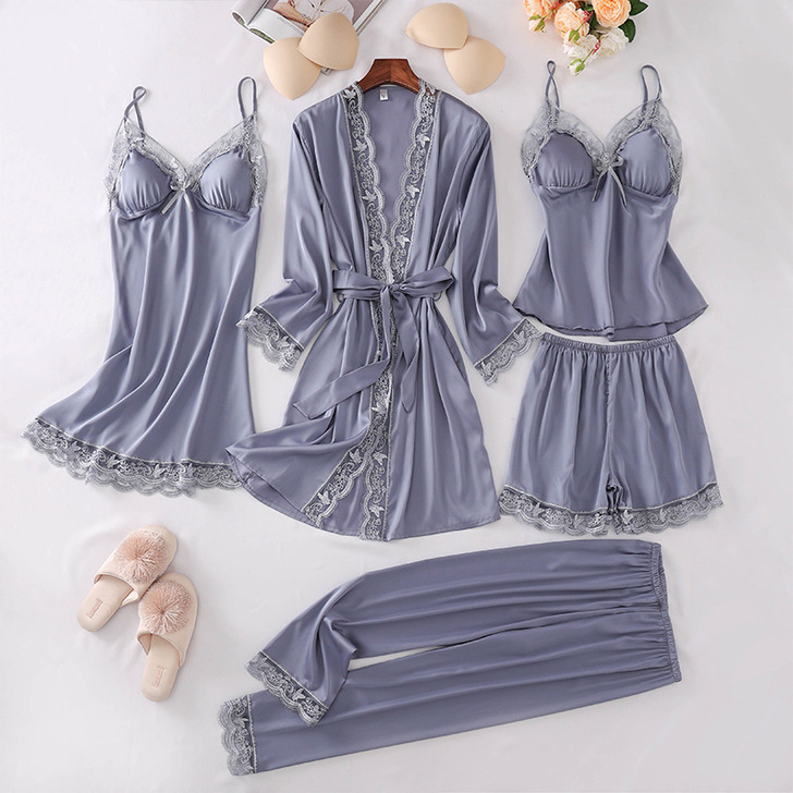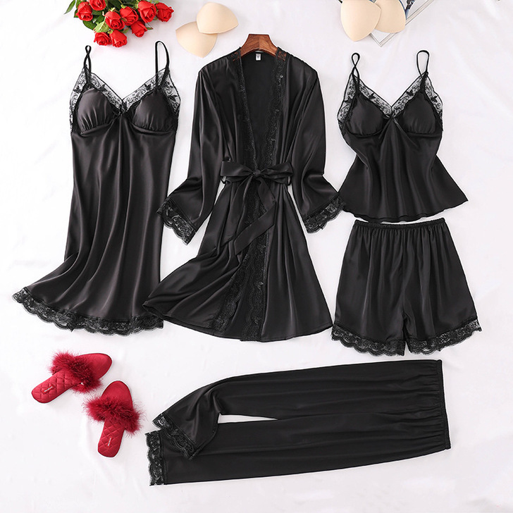 웨딩 잠옷 여성의 봄과 가을 다섯 조각 세트 여름 아이스 실크 슬링 섹시한 플러스 사이즈 웨딩 잠옷 신부의 아침 로브스토어 가기