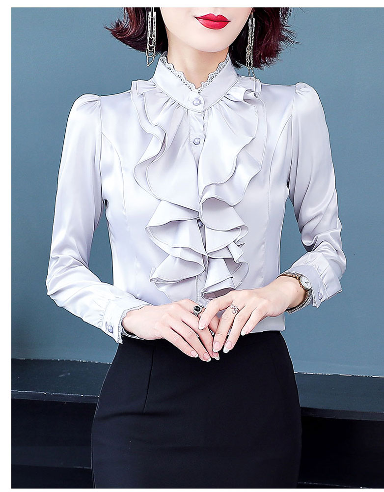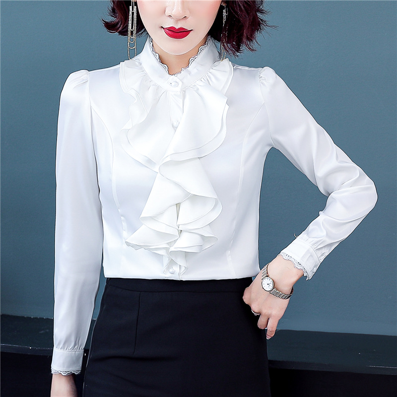 화이트 셔츠 여성용 긴팔 가을과 겨울 한국 스타일 패션 새틴 쉬폰 탑 프로페셔널 슬림핏 스탠딩 칼라 러플 셔츠
