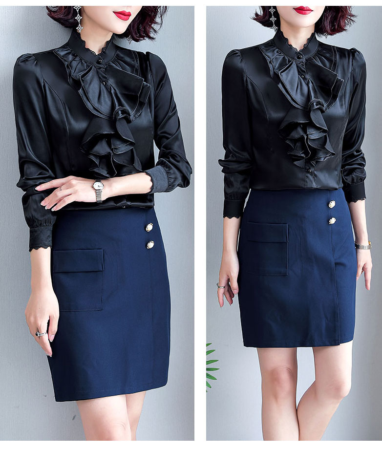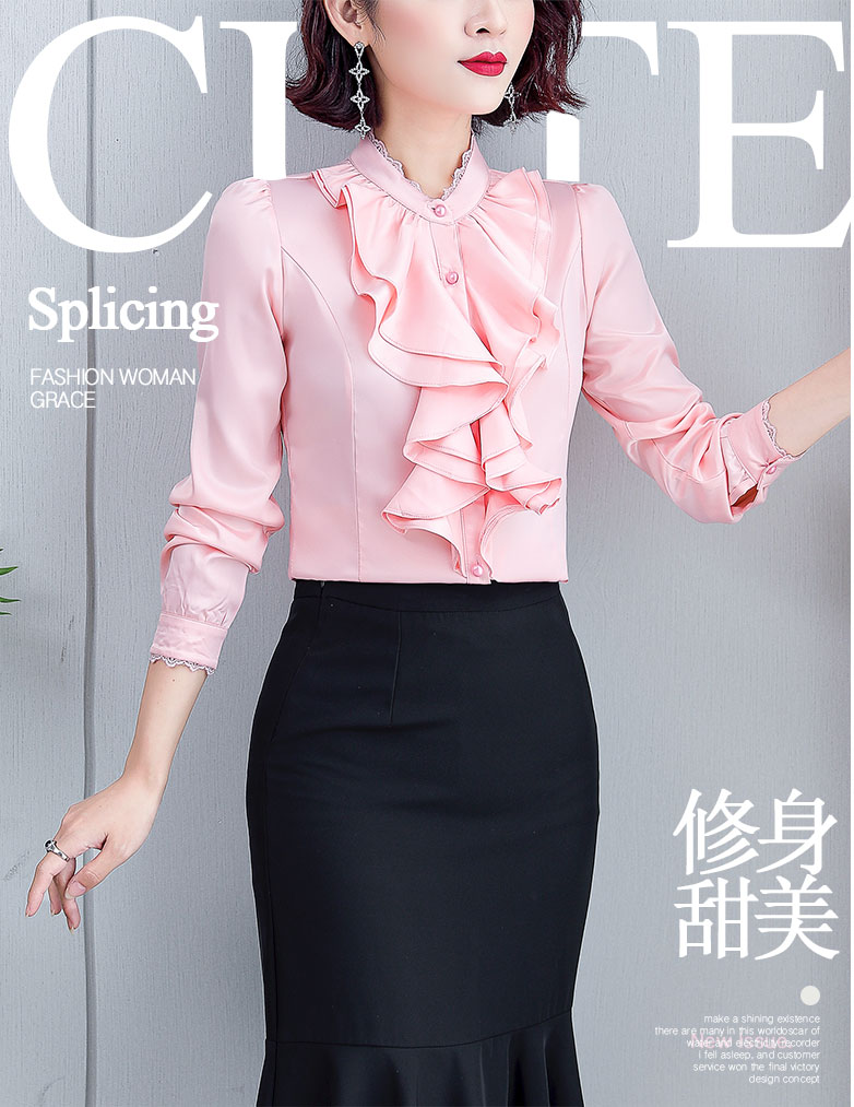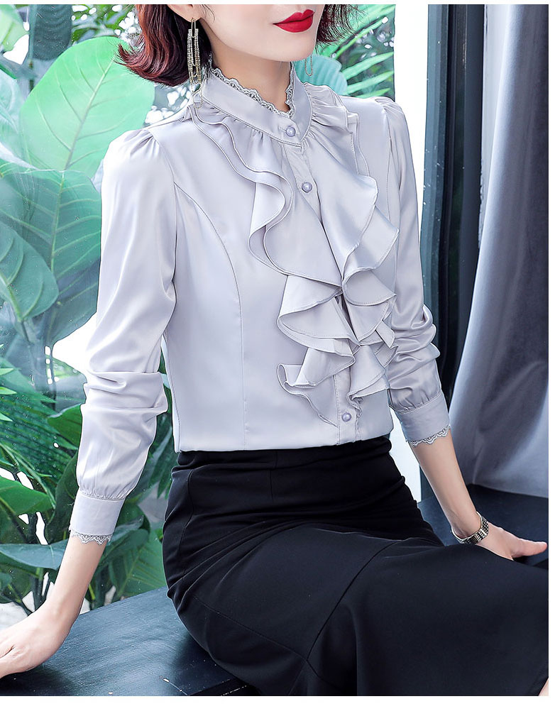 화이트 셔츠 여성용 긴팔 가을과 겨울 한국 스타일 패션 새틴 쉬폰 탑 프로페셔널 슬림핏 스탠딩 칼라 러플 셔츠스토어 가기
