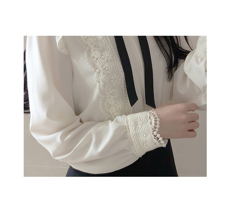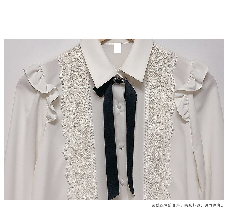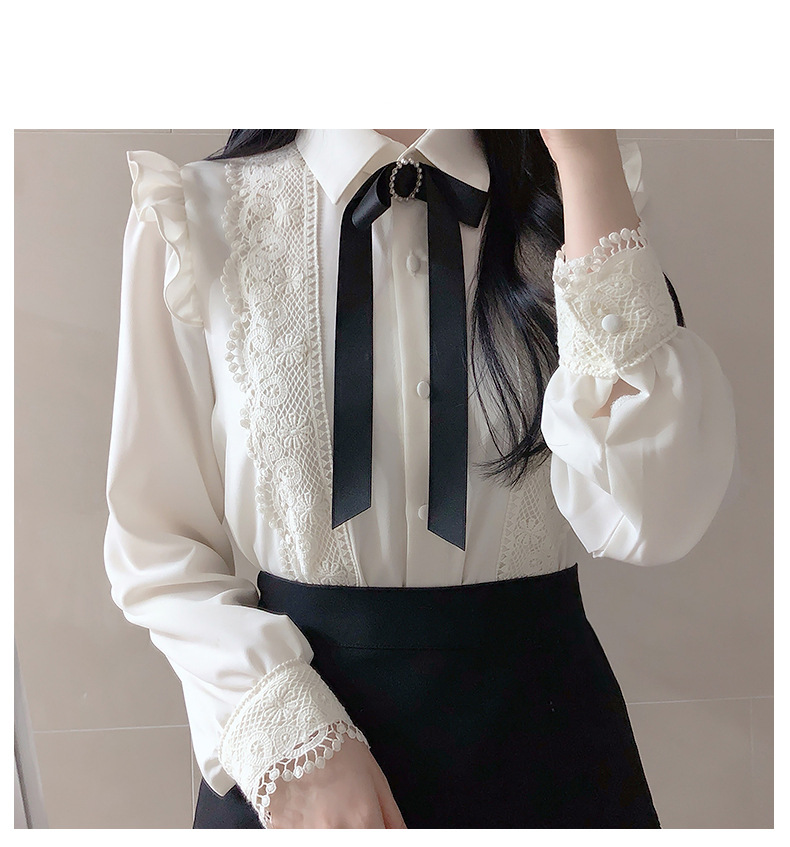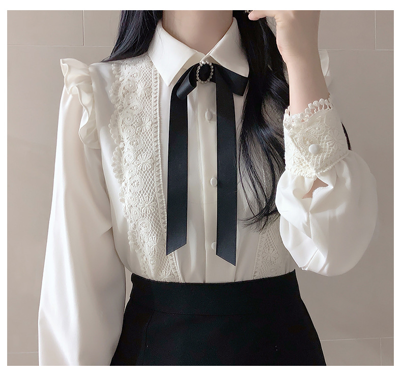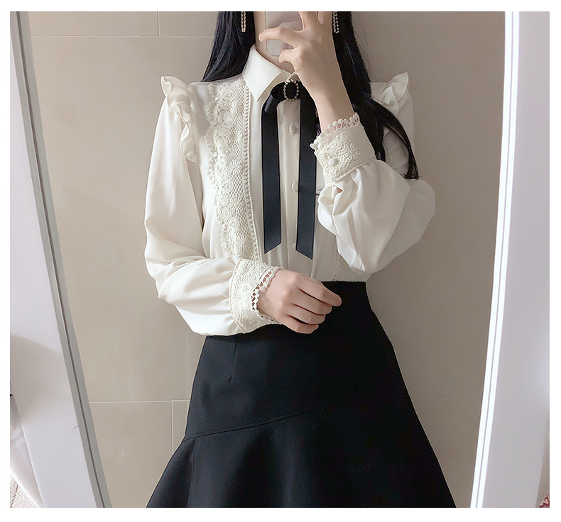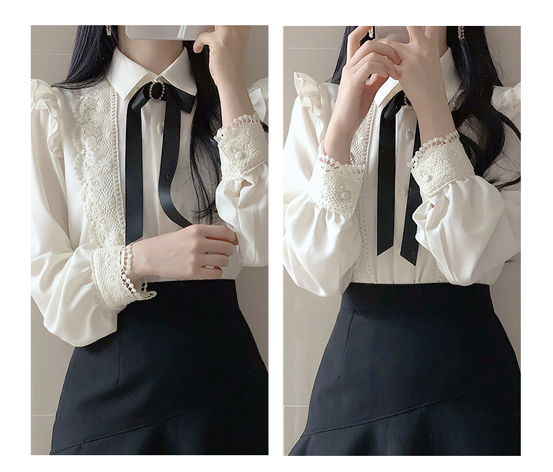 여성을위한 달콤한 우아한 레이스 셔츠 봄과 가을 새로운 긴 소매 나비 쉬폰 화이트 셔츠 인형 칼라 탑