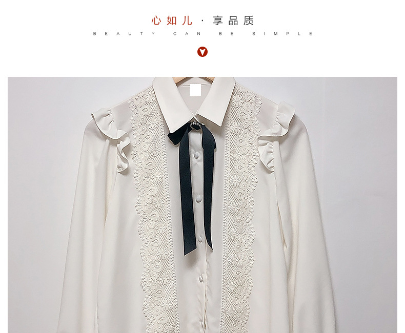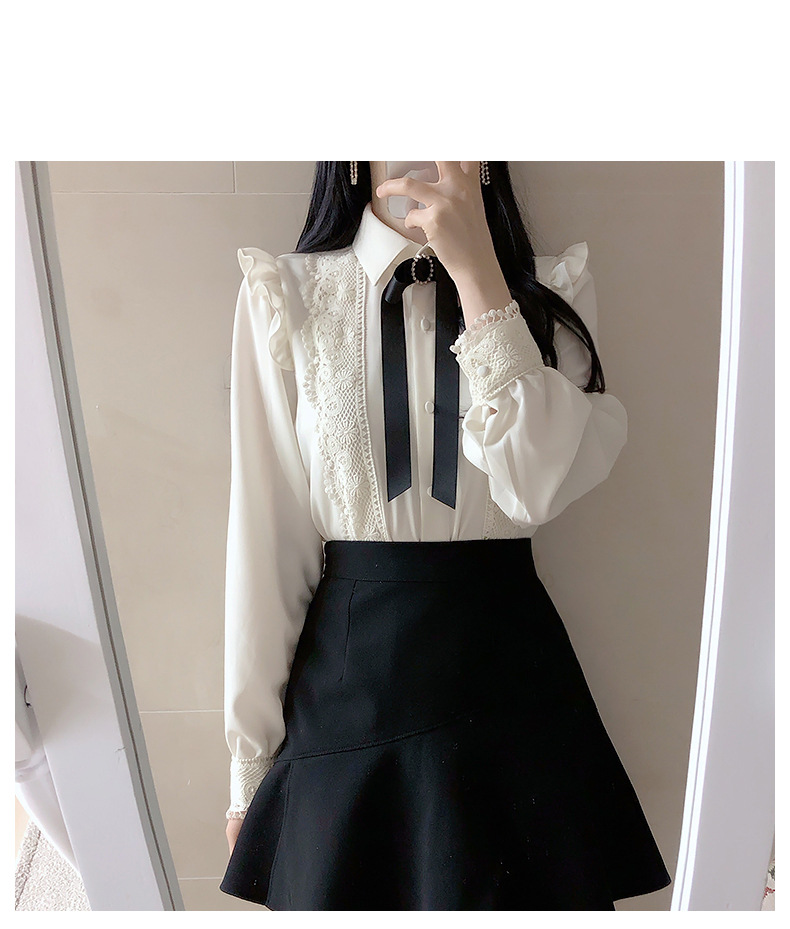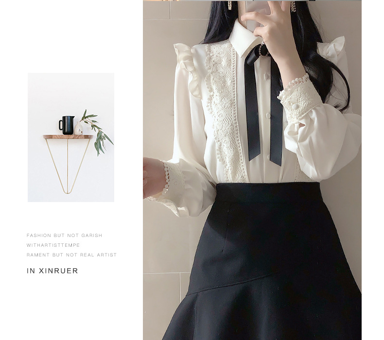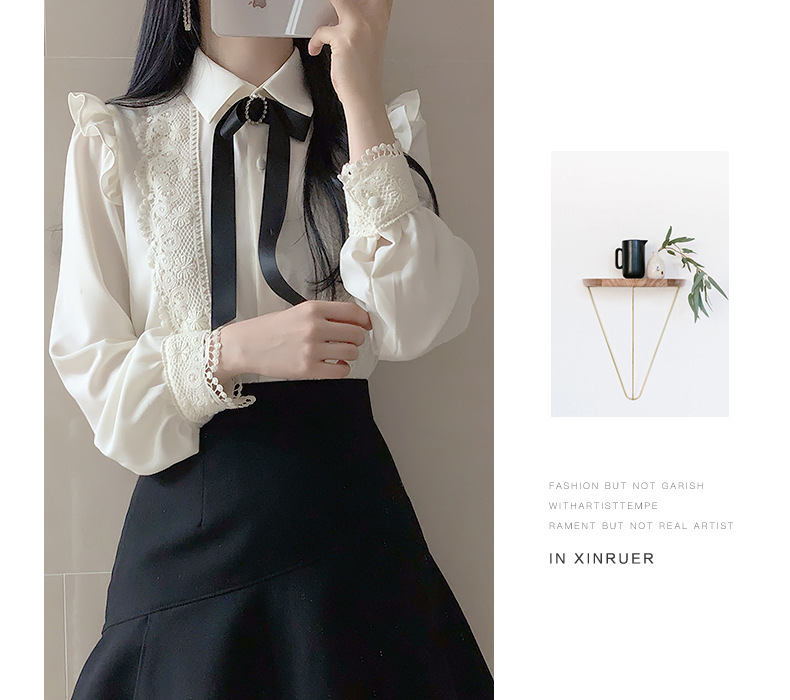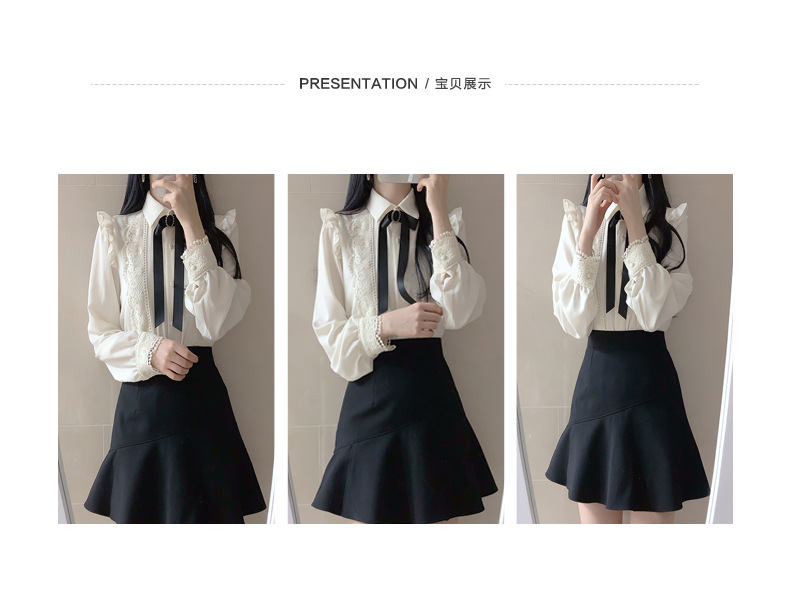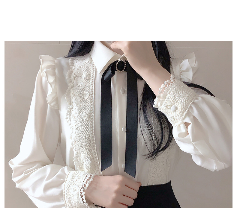 여성을위한 달콤한 우아한 레이스 셔츠 봄과 가을 새로운 긴 소매 나비 쉬폰 화이트 셔츠 인형 칼라 탑