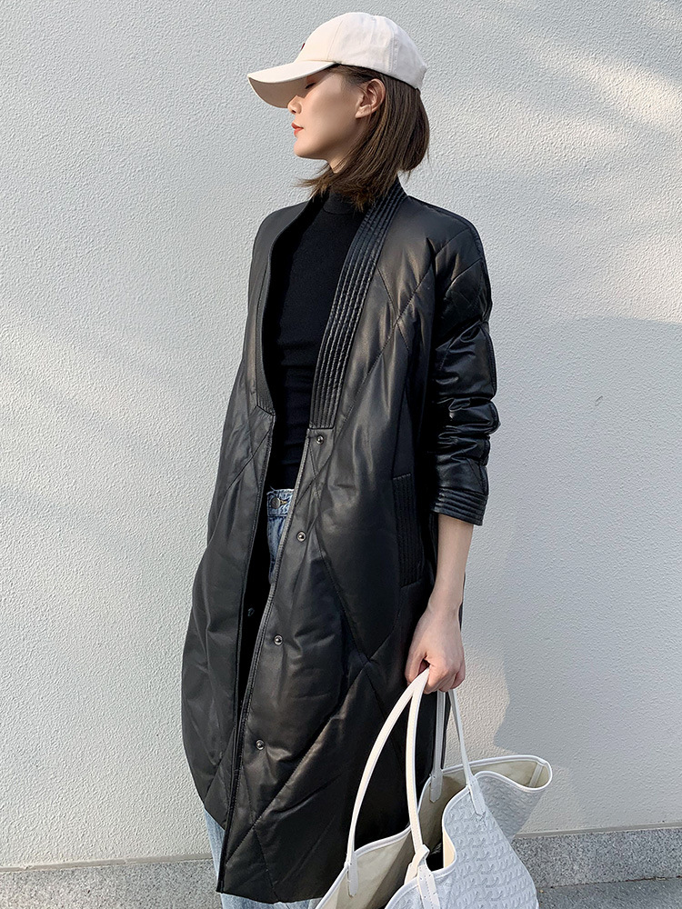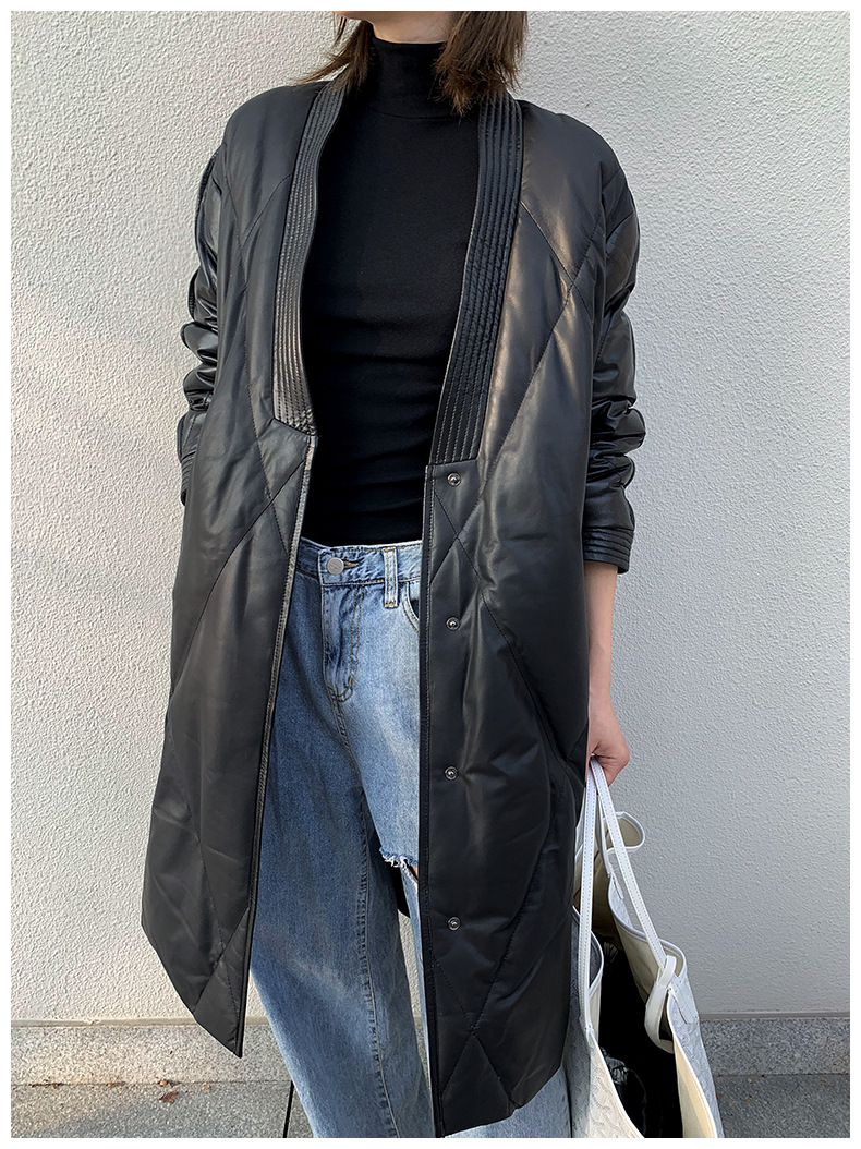 해닝 천연 가죽 다운 재킷 겨울 신상 2025 여성용 천연 가죽 코트 여성용 중간 길이 패션 루즈핏 재킷