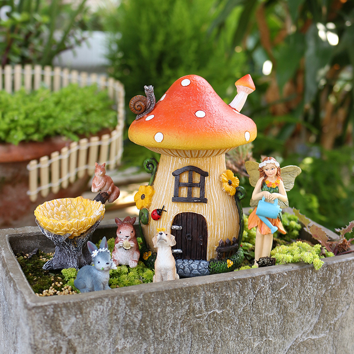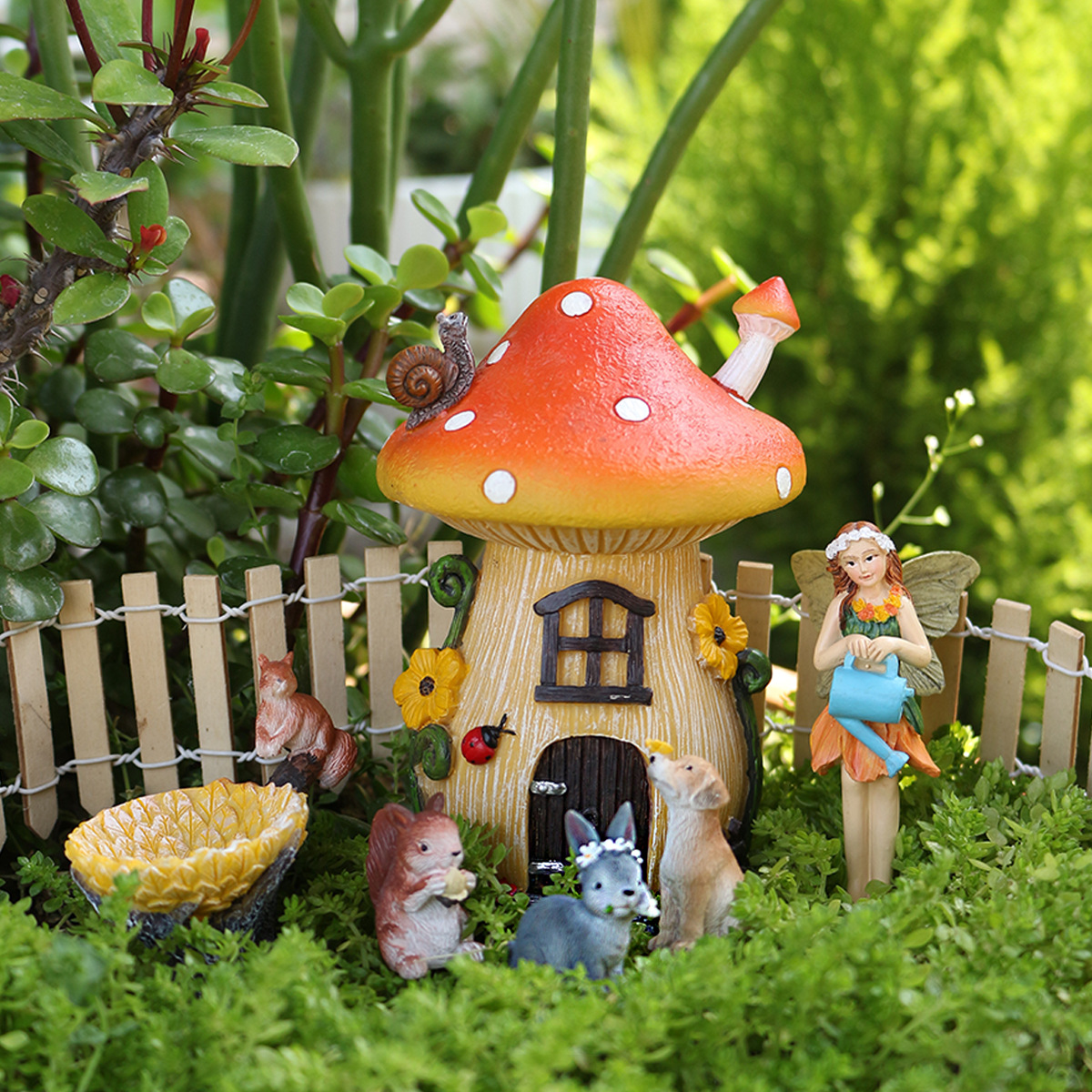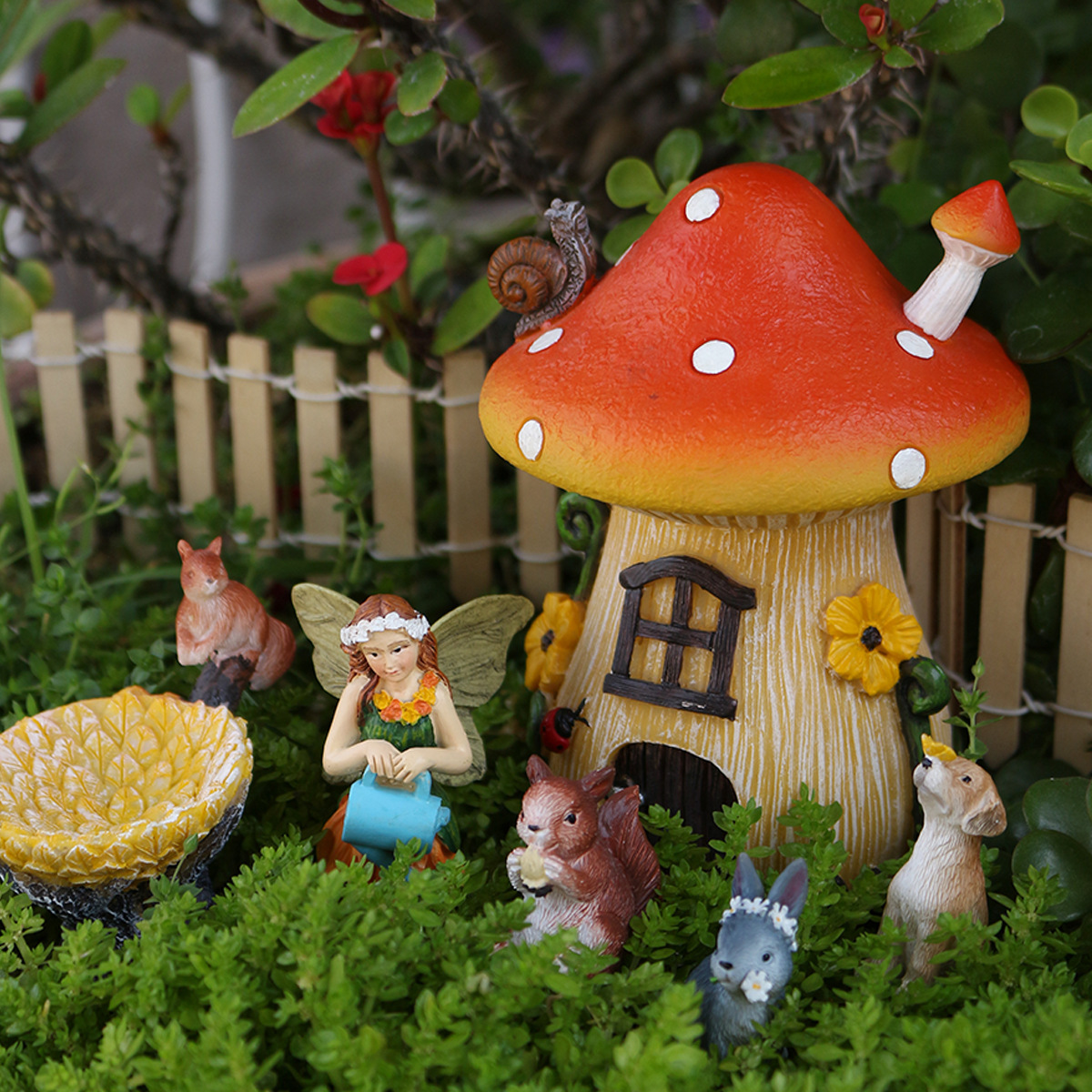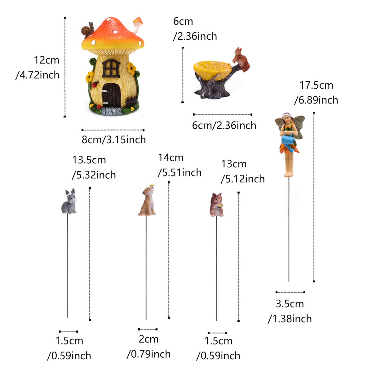 【产品尺寸】蘑菇房:12cm高度女孩:7cm高度狗,松鼠:4cm 兔子:3cm高度 树木:6cm高度