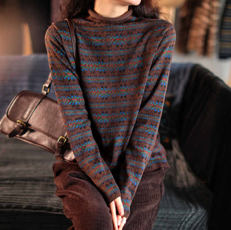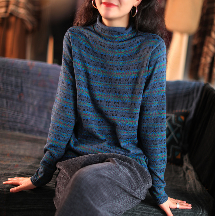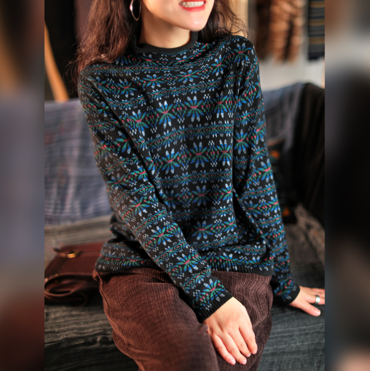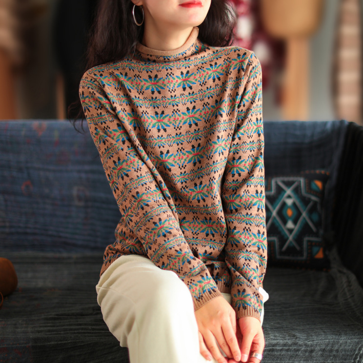 2020 겨울 신상품 면사 인쇄 예술적 레트로 슬리밍 모든 매치 하프 터틀넥 여성용 따뜻한 스웨터스토어 가기