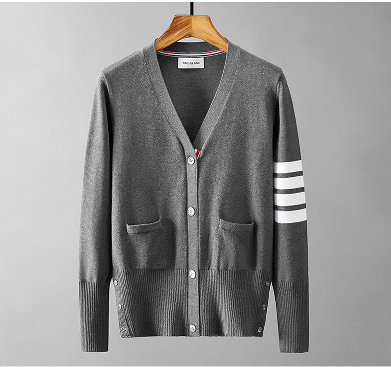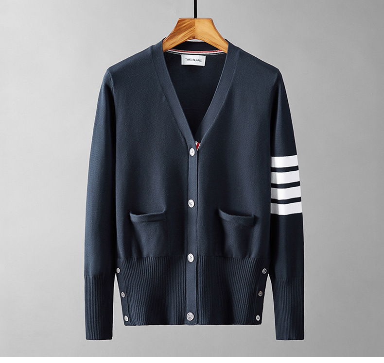 2025 가디건 스웨터, 포켓이 있는 패셔너블한 긴팔, 네 줄 스트라이프, 트렌디하고 따뜻한 가을 겨울 신상 남성복, 순면 스트라이프스토어 가기