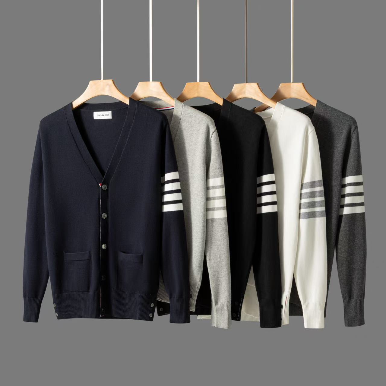 2025 가디건 스웨터, 포켓이 있는 패셔너블한 긴팔, 네 줄 스트라이프, 트렌디하고 따뜻한 가을 겨울 신상 남성복, 순면 스트라이프