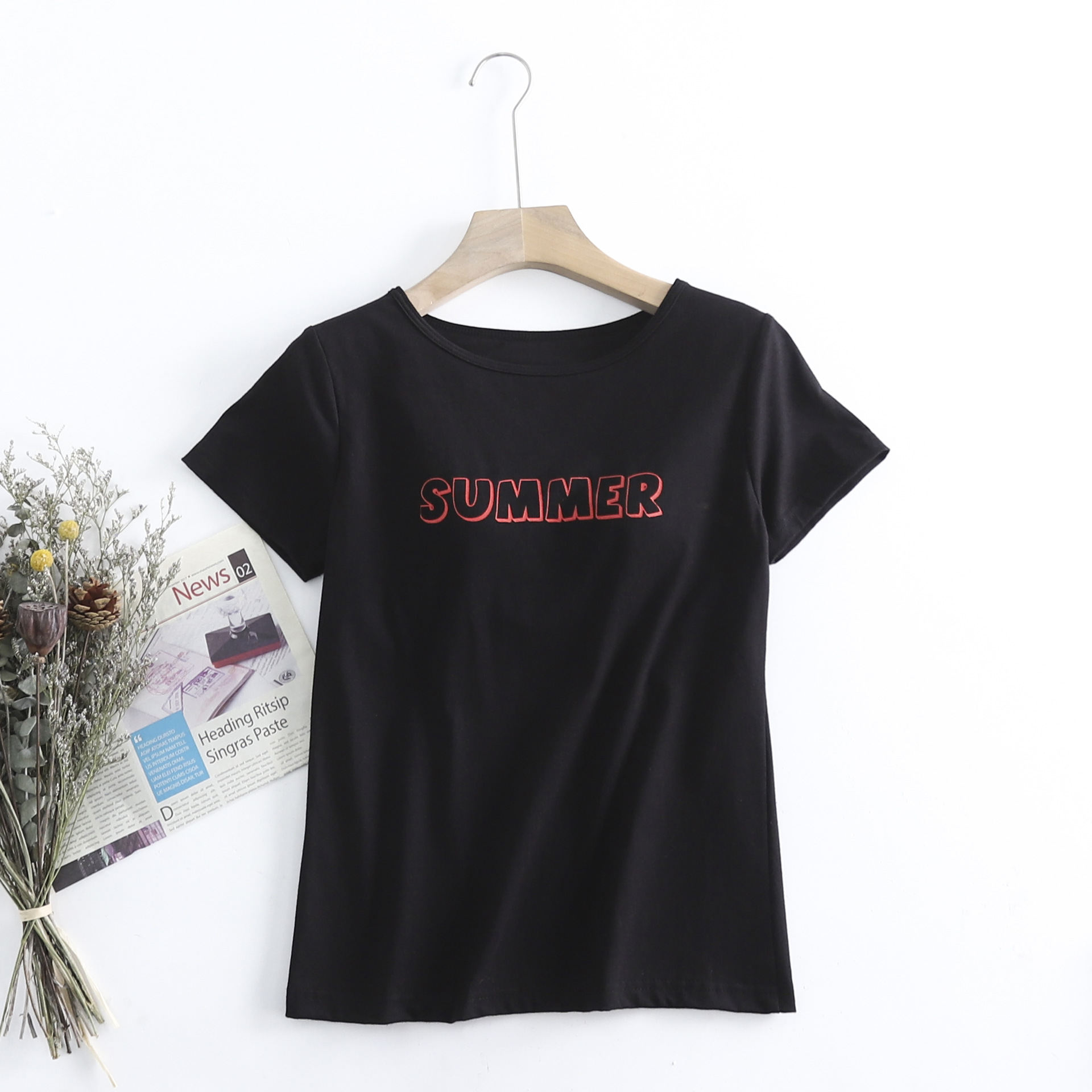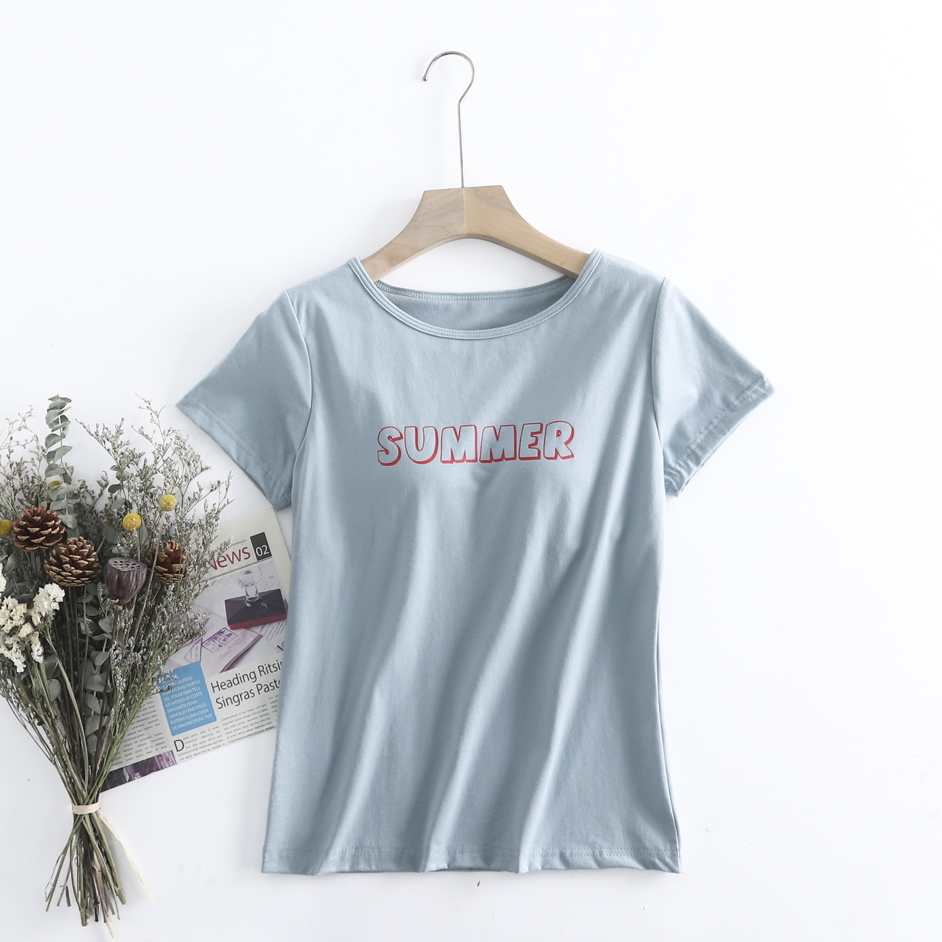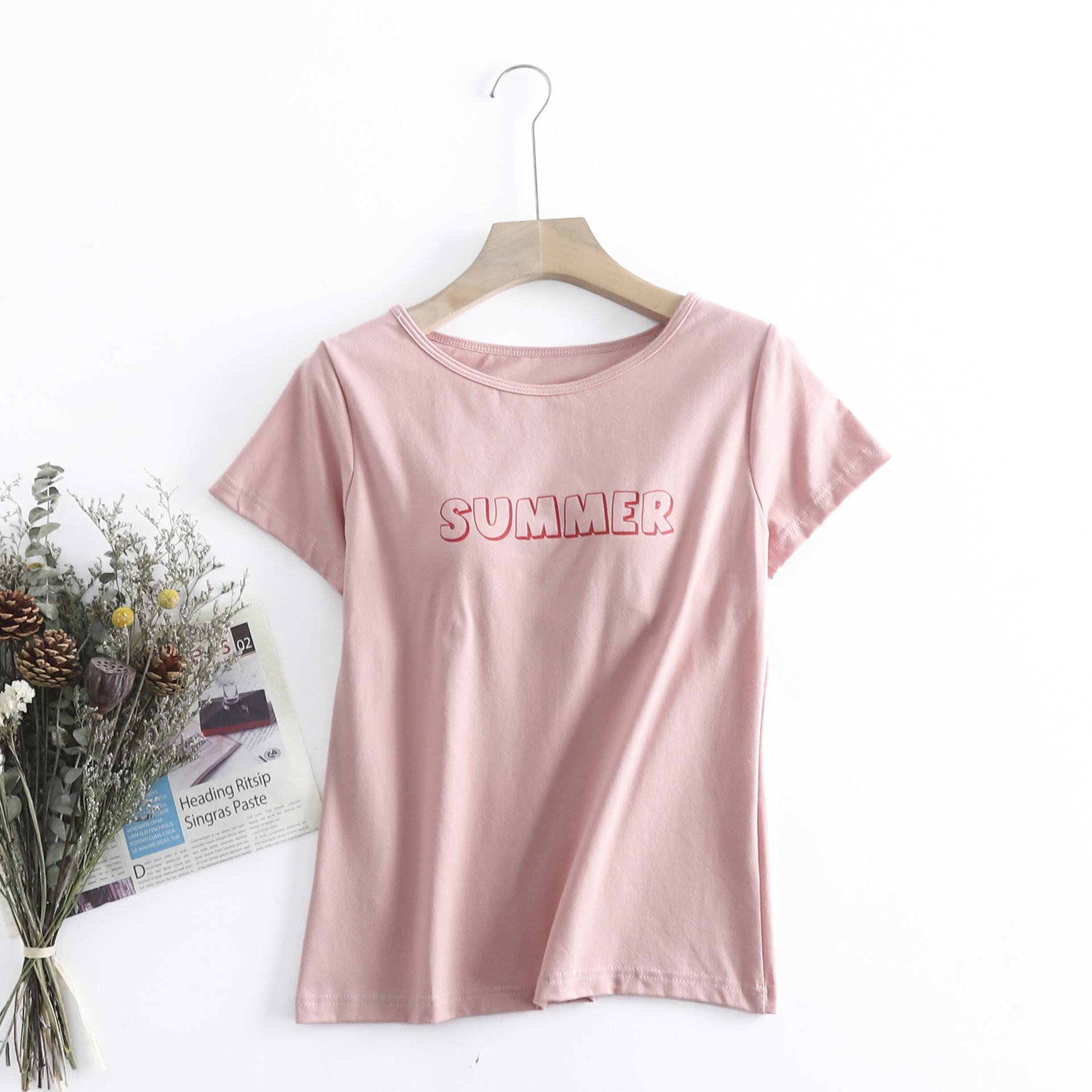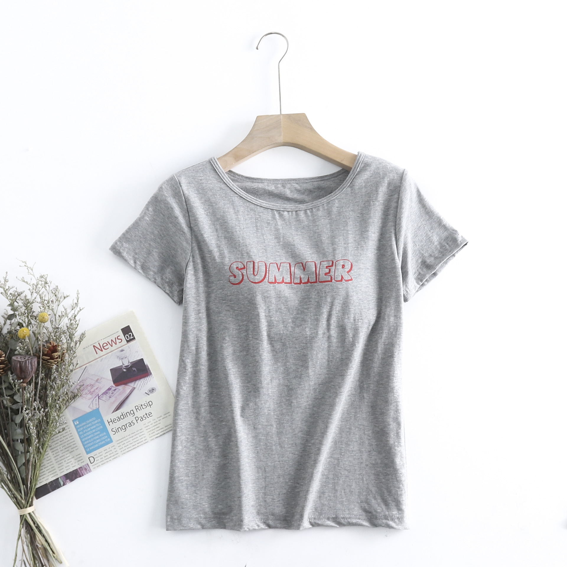 코튼 프린트 컵 원피스 반소매 가슴 패드 컵 반소매 여성용 여름 루즈한 버전 무료 브라 반팔 티셔츠스토어 가기