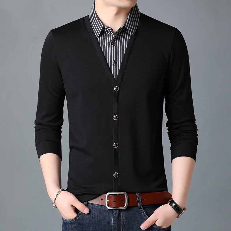 【】남성 셔츠 칼라 투피스 티셔츠 스트라이프 긴팔 슬림핏 이너 티셔츠 6300 시리즈 청년 스플라이싱