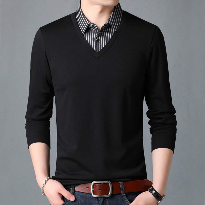 【】남성 셔츠 칼라 투피스 티셔츠 스트라이프 긴팔 슬림핏 이너 티셔츠 6300 시리즈 청년 스플라이싱스토어 가기