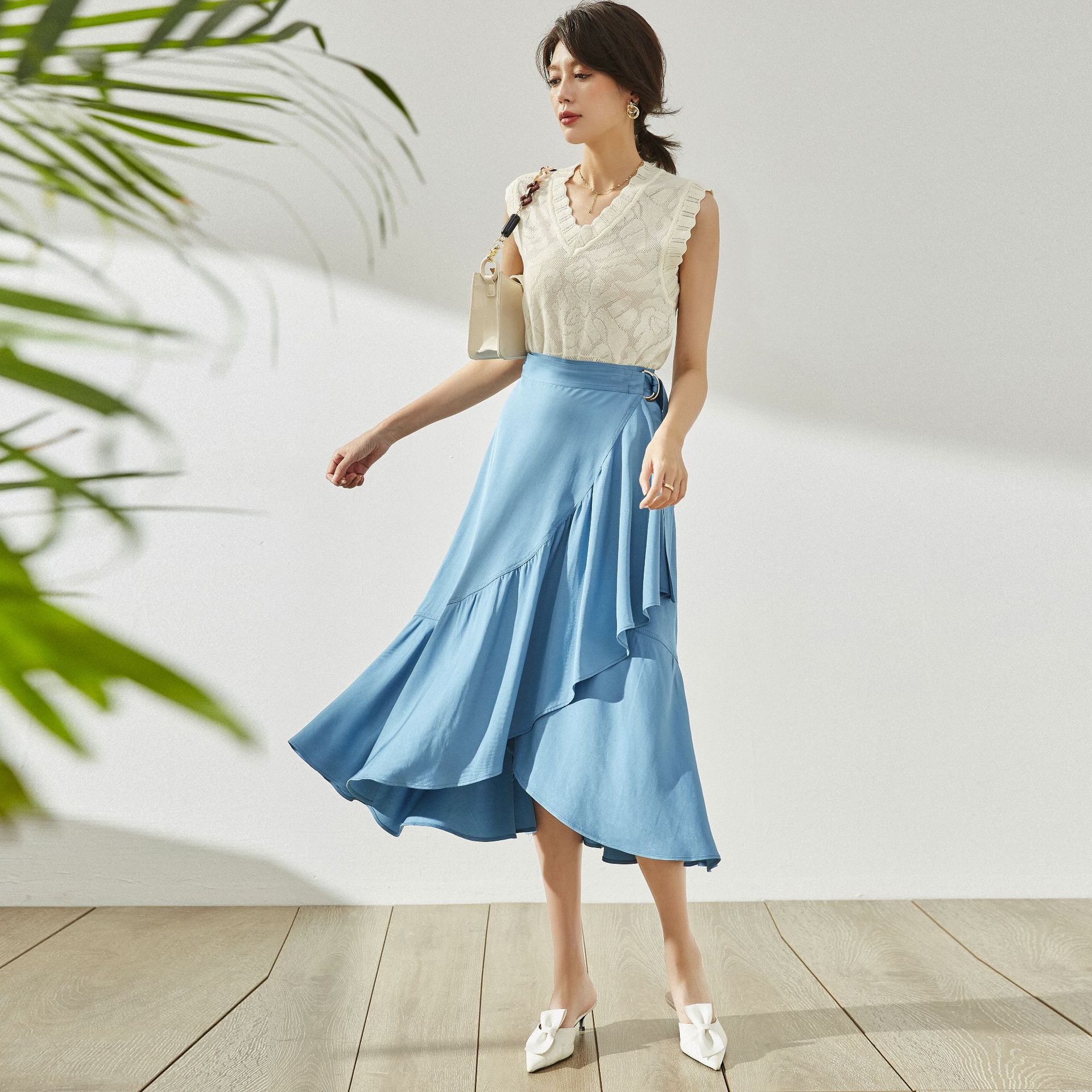 小A字摆又带点鱼尾,大荷边足够有造型感,腰头加D形环调节腰带大小,也有装饰作用,一片式裙方便穿脱这款亮点除了面料还有腰头掌柜家设计了可调节腰围大小,两粒扣可调节腰围,适合人群更广~