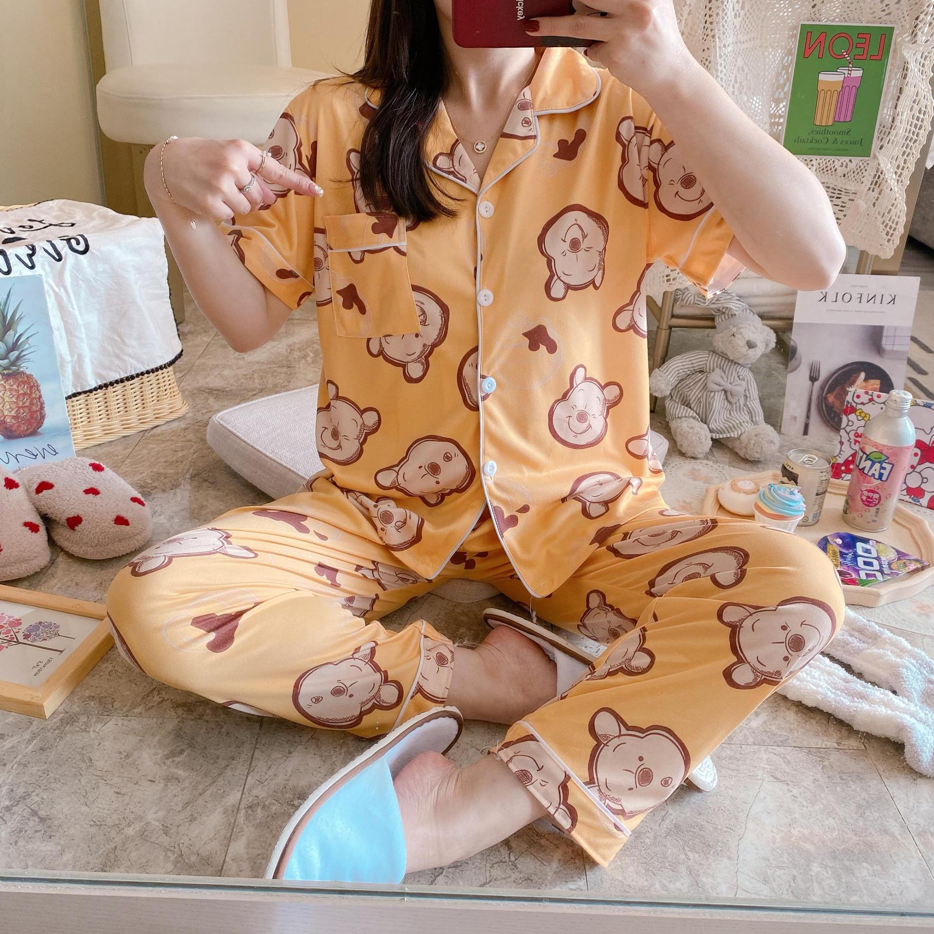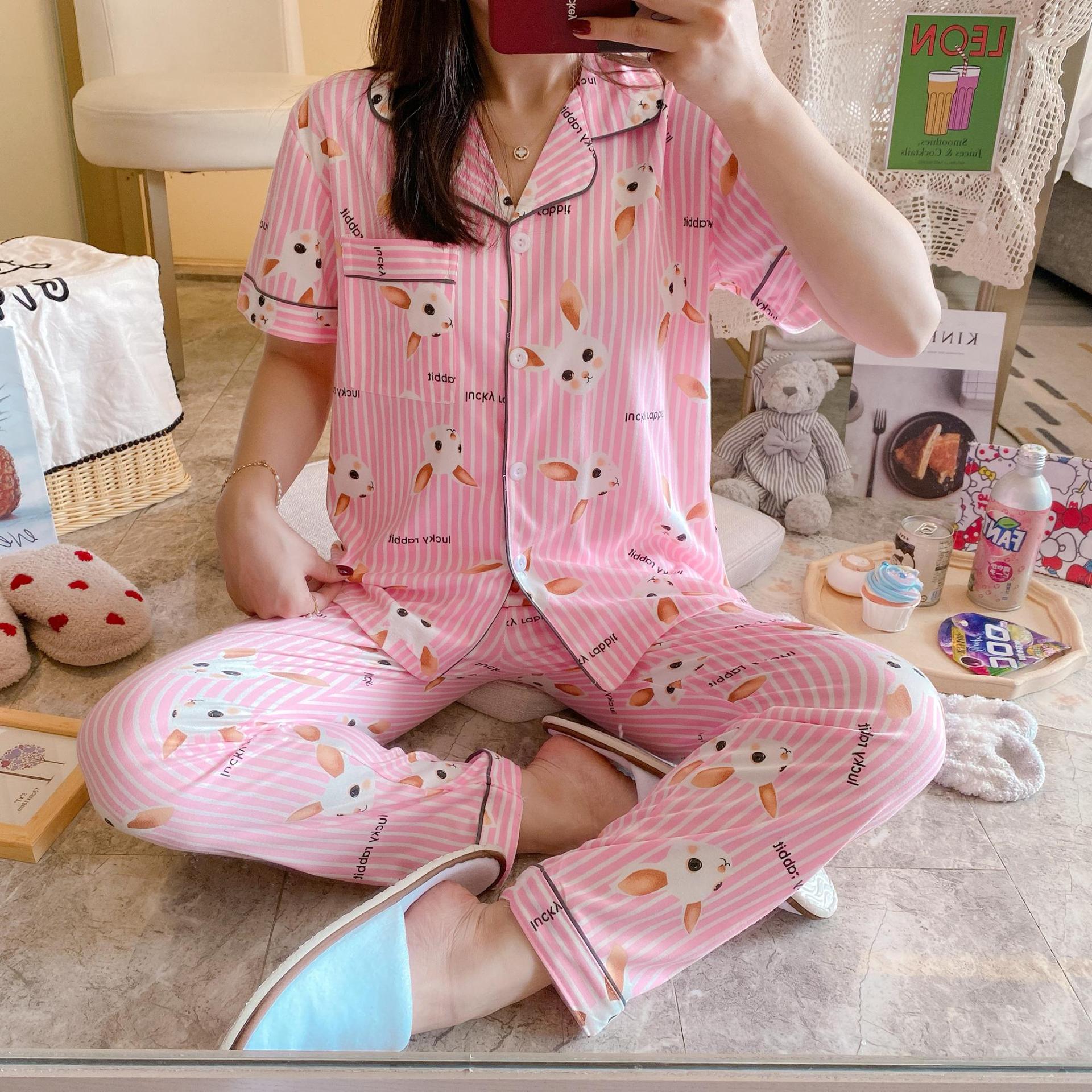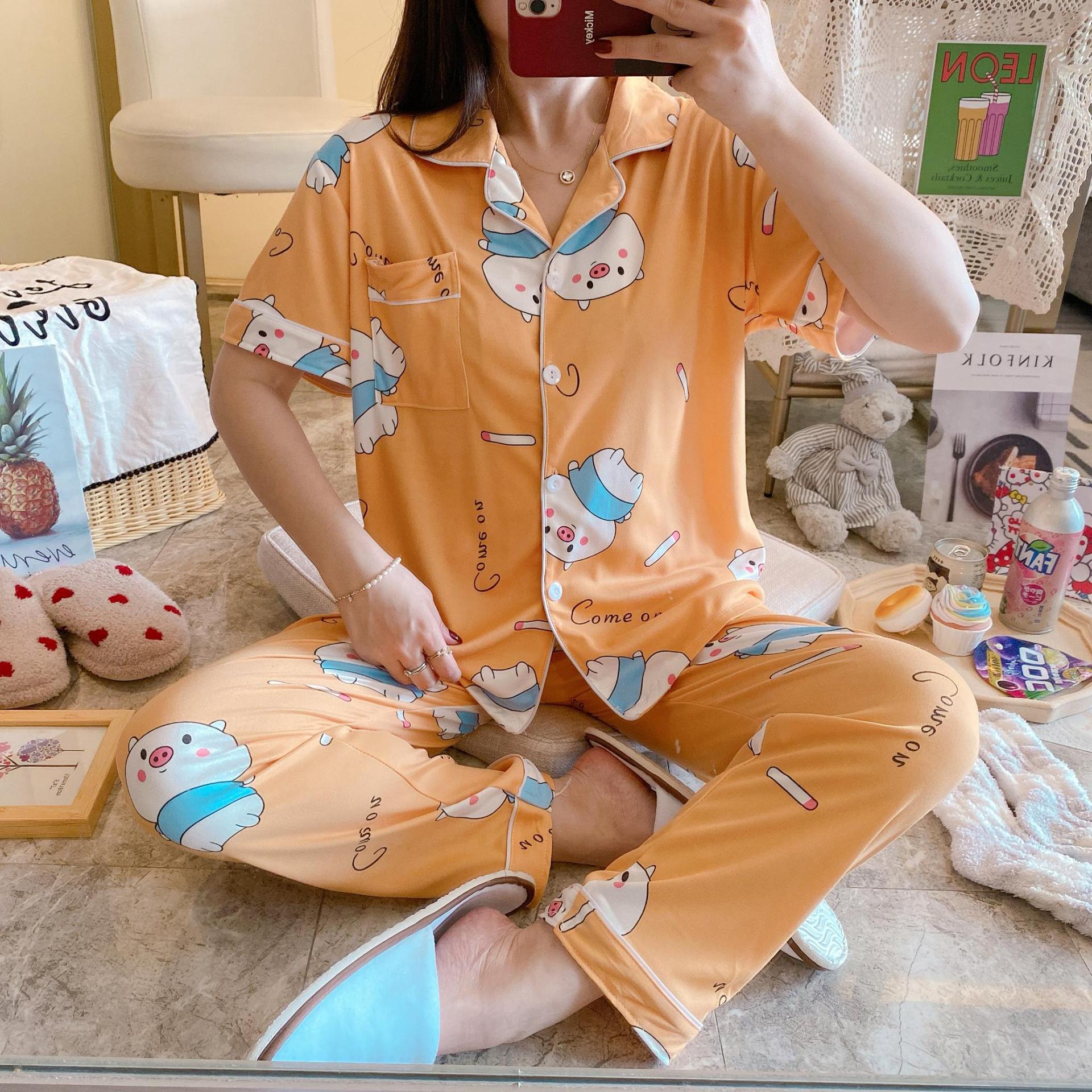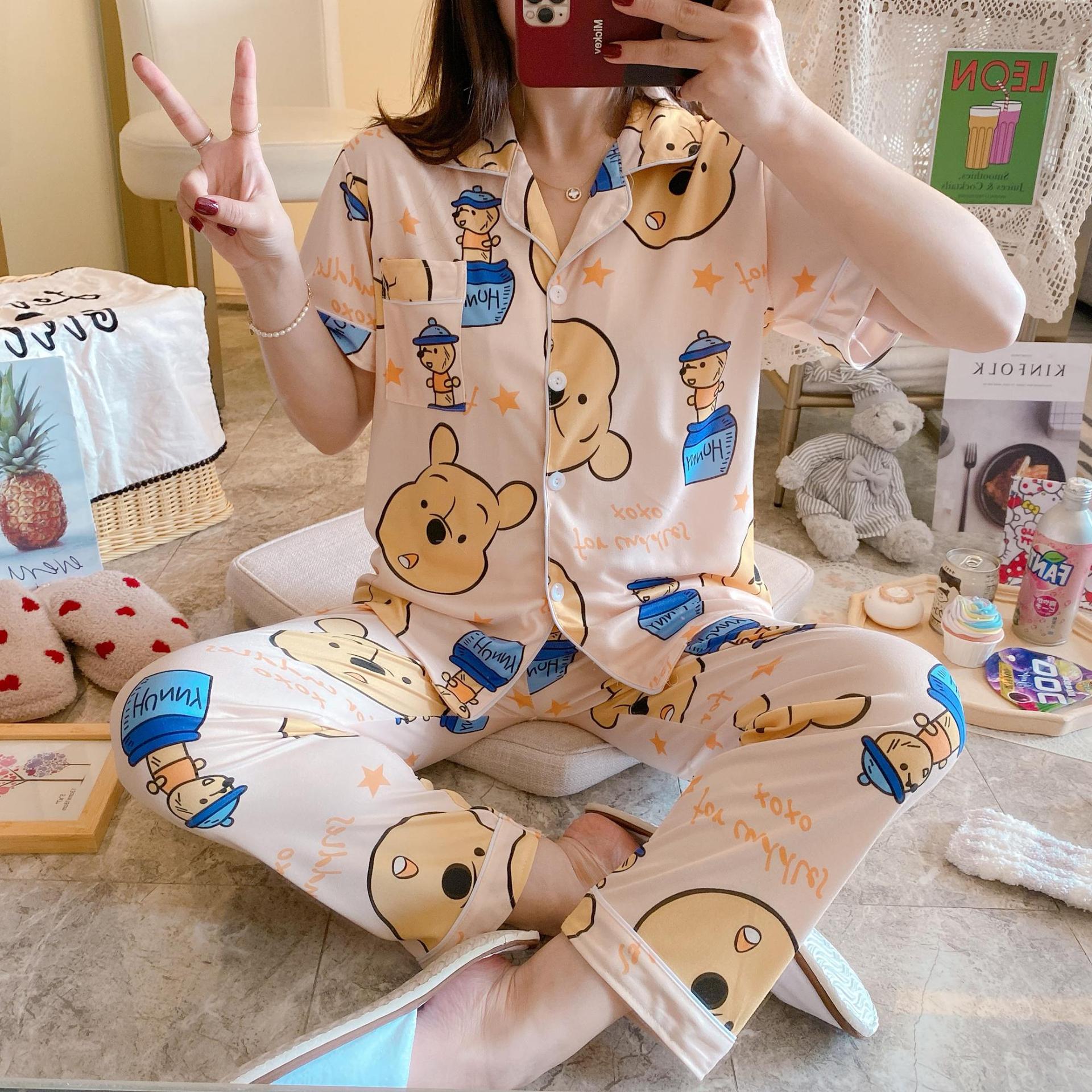 봄과 여름 새로운 반팔 바지 카디건 잠옷 소녀 우유 실크 한국 만화 가정 의류 세트 크로스 보더 도매스토어 가기