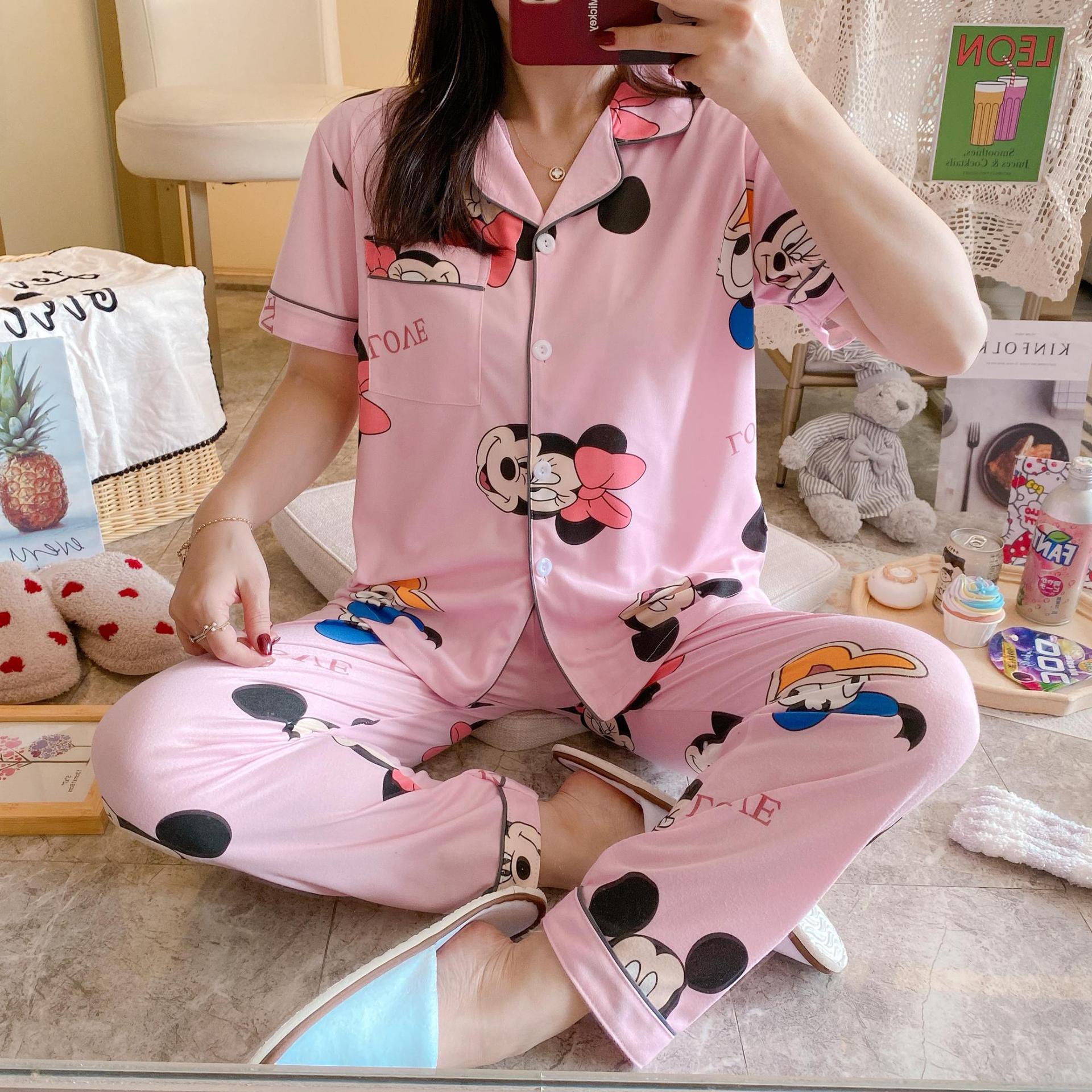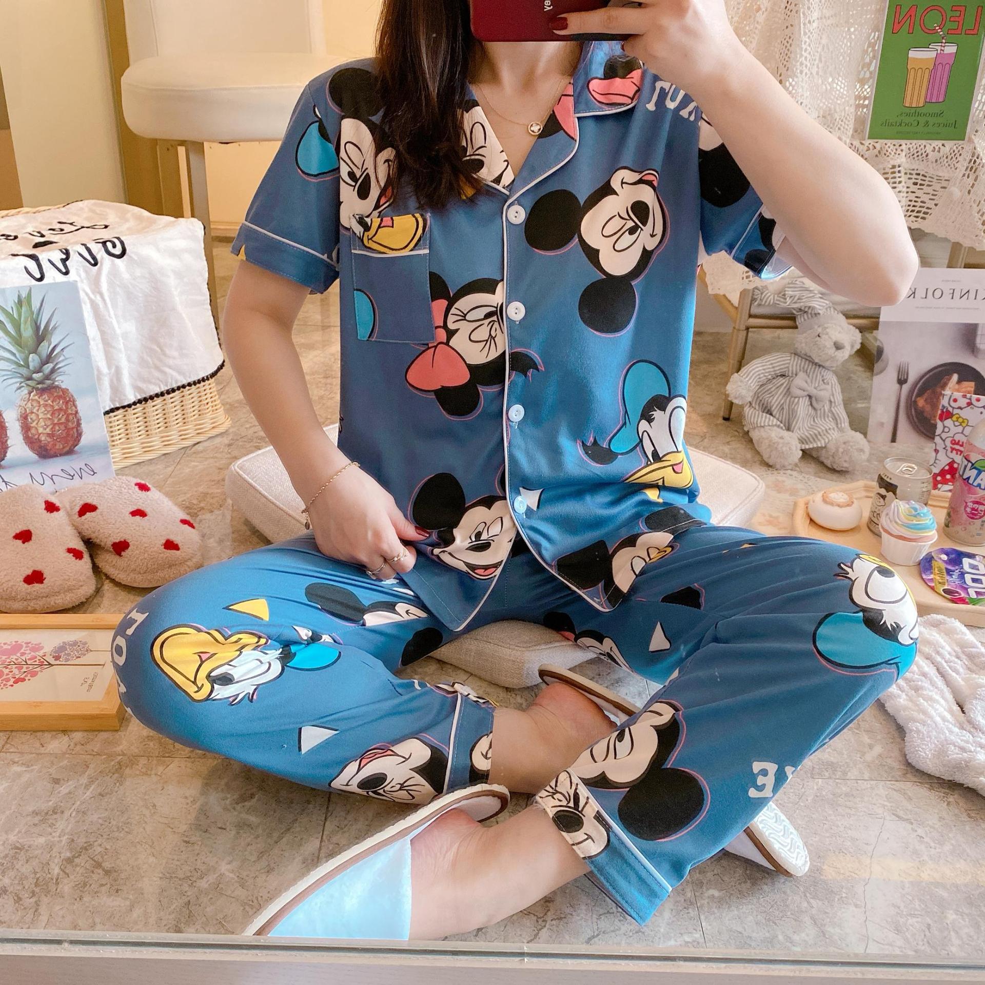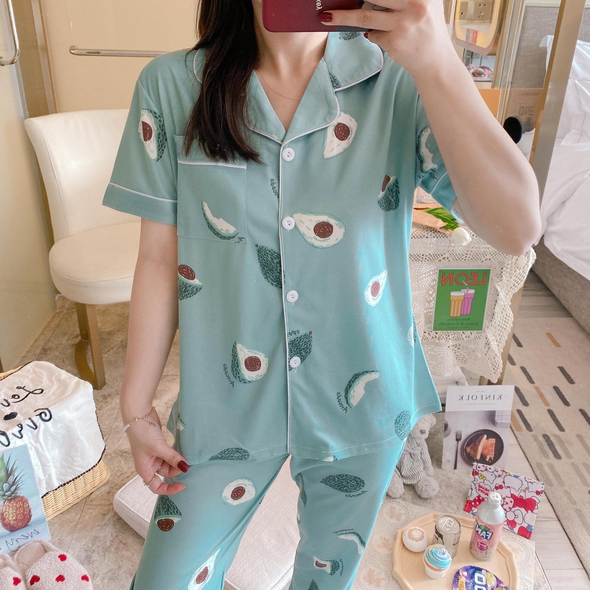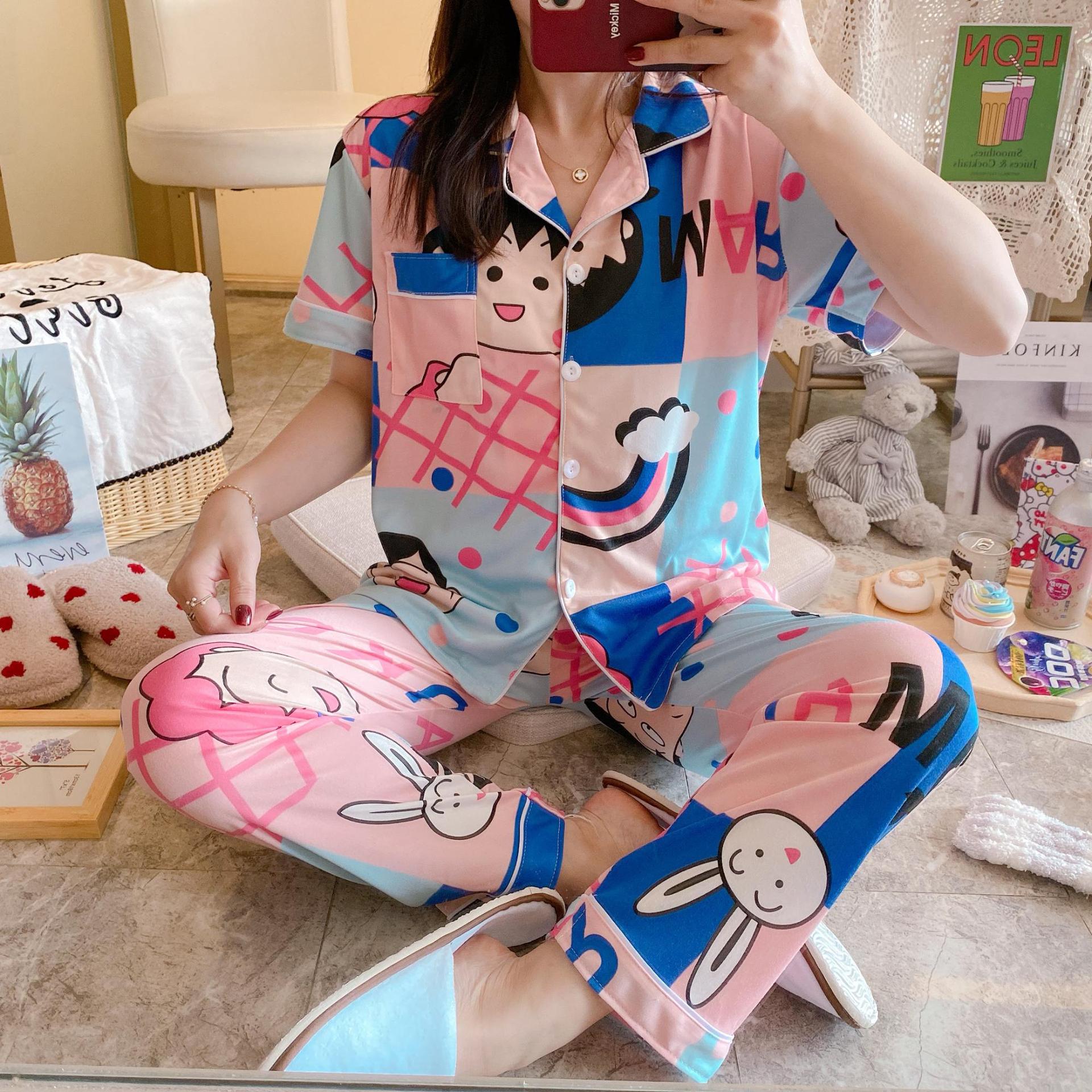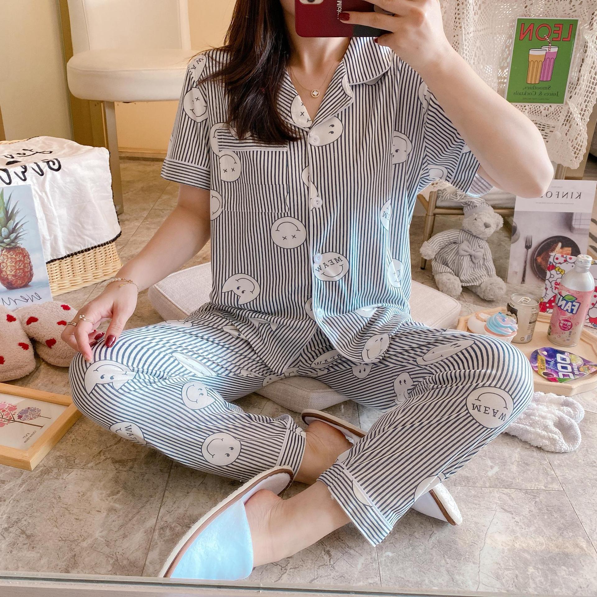 봄과 여름 새로운 반팔 바지 카디건 잠옷 소녀 우유 실크 한국 만화 가정 의류 세트 크로스 보더 도매스토어 가기