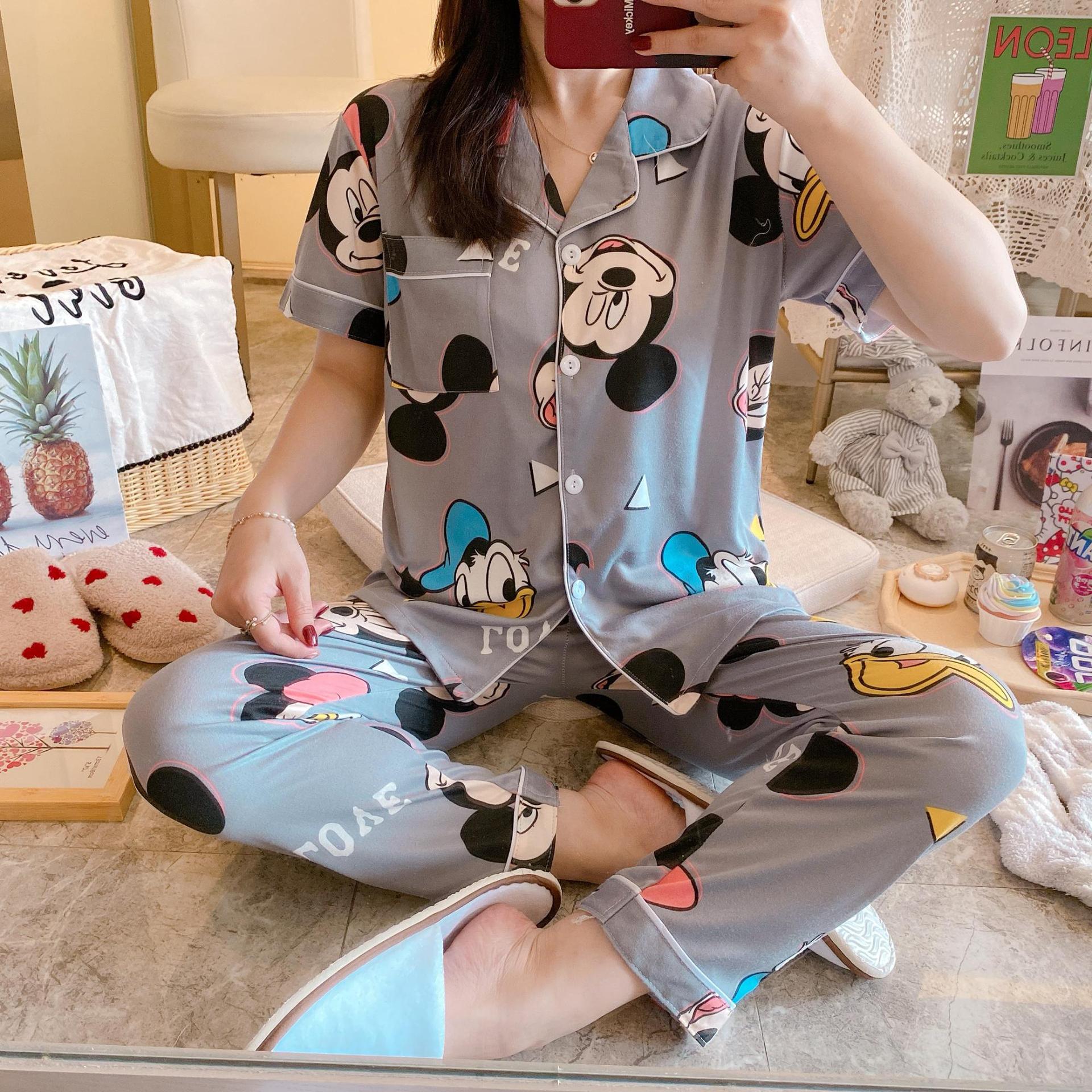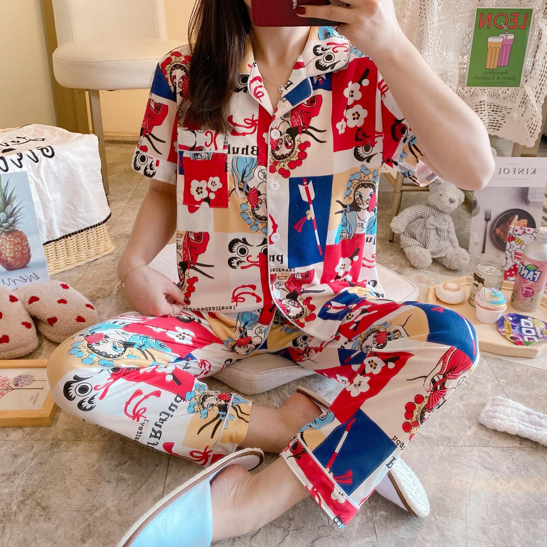 봄과 여름 새로운 반팔 바지 카디건 잠옷 소녀 우유 실크 한국 만화 가정 의류 세트 크로스 보더 도매