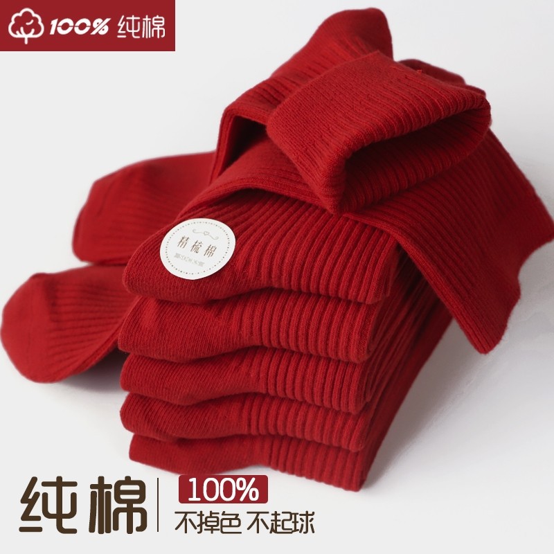 해이이나 레드 양말 남녀 공용 순색 면 양말 중간 길이 양말 겨울용 두꺼운 보온 양말 용의 해 축복 양말스토어 가기