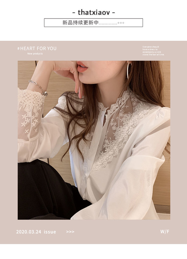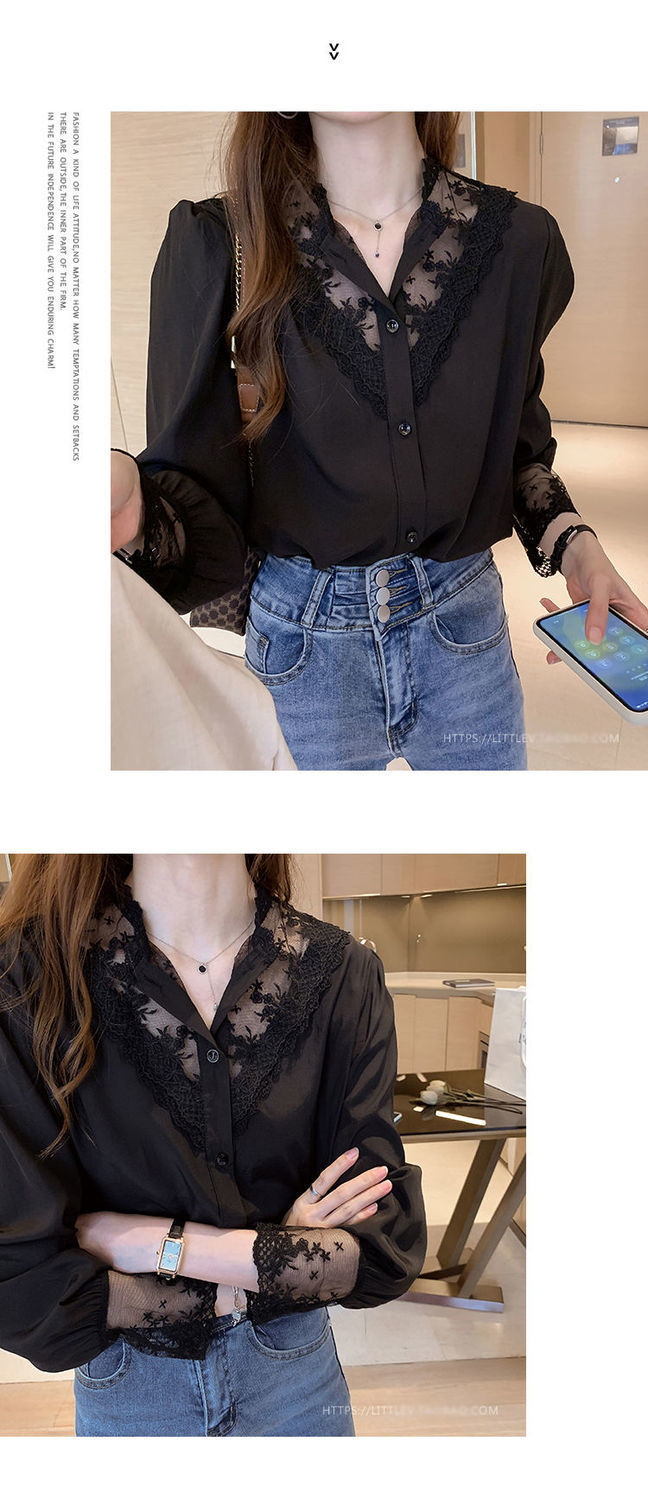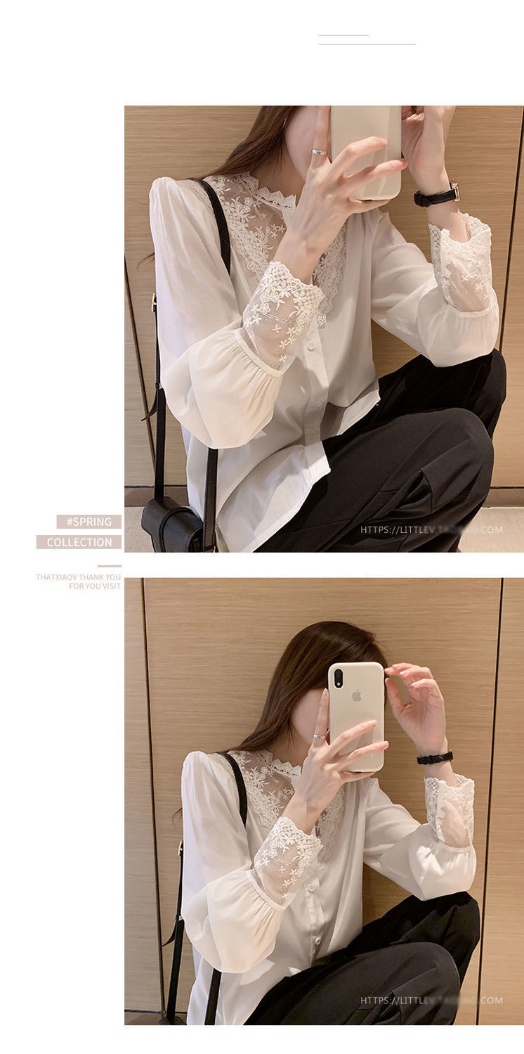 레이스베이스 셔츠 여성의 봄과 가을 새로운 도착 디자인 센스 틈새 인테리어 스타일 탑 쉬폰 바느질 셔츠스토어 가기