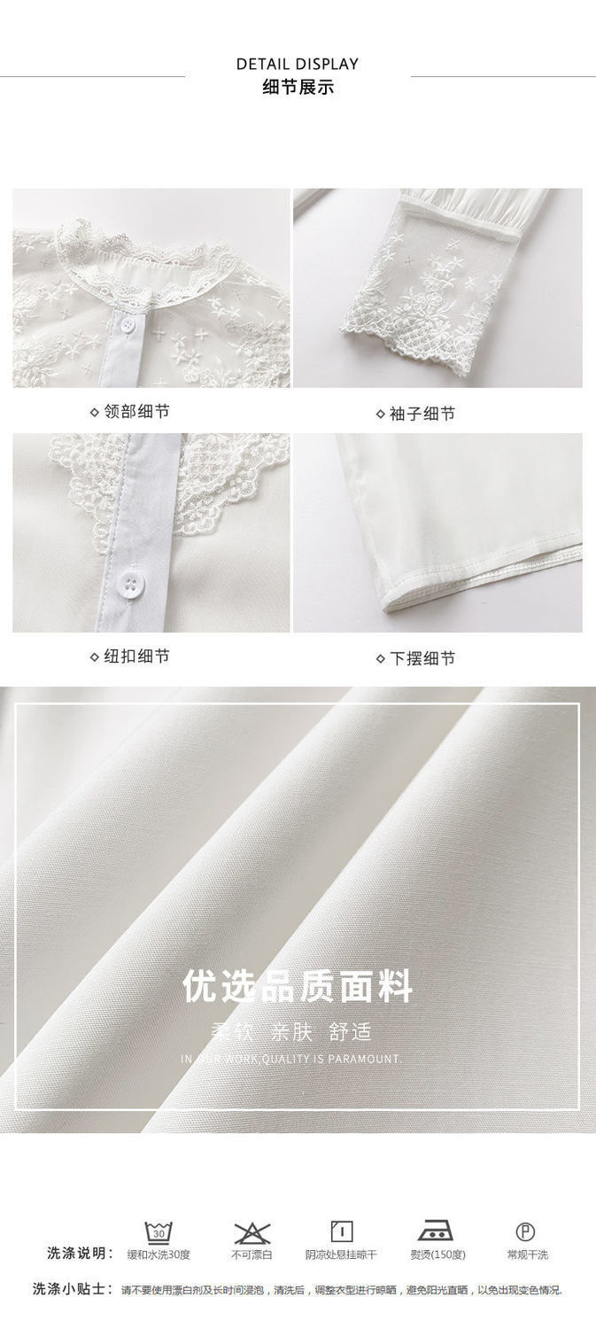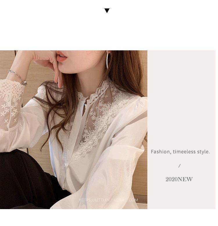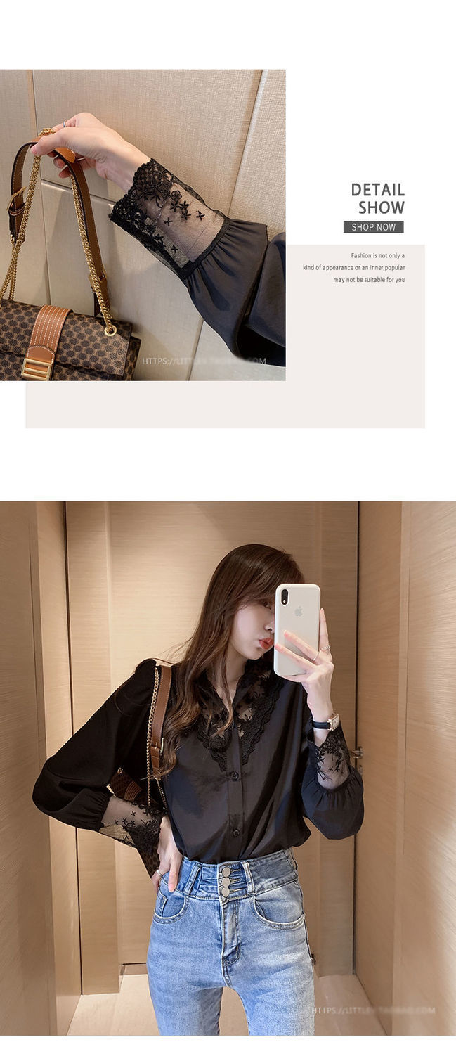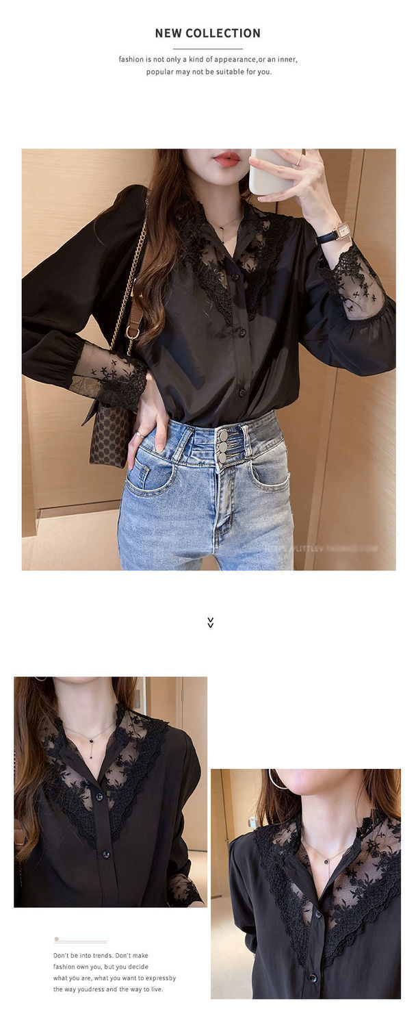 레이스베이스 셔츠 여성의 봄과 가을 새로운 도착 디자인 센스 틈새 인테리어 스타일 탑 쉬폰 바느질 셔츠스토어 가기