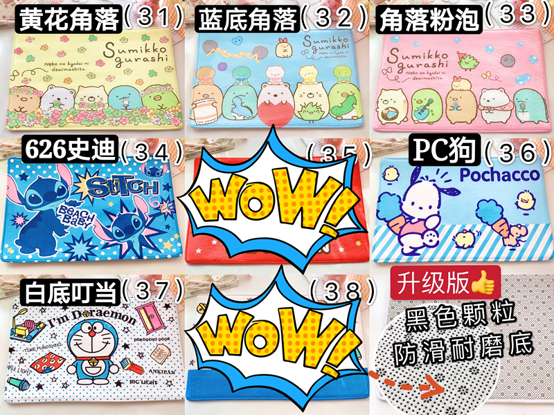新款新图案多图可爱 卡 通 图案,正面法莱绒材质吸水吸尘不掉色不掉绒,手感舒适,背面黑色颗粒防滑耐磨底,使用范围:玄关、浴室、卧室、客厅、门口、阳台以及走廊【环保无味,透气不发粘】