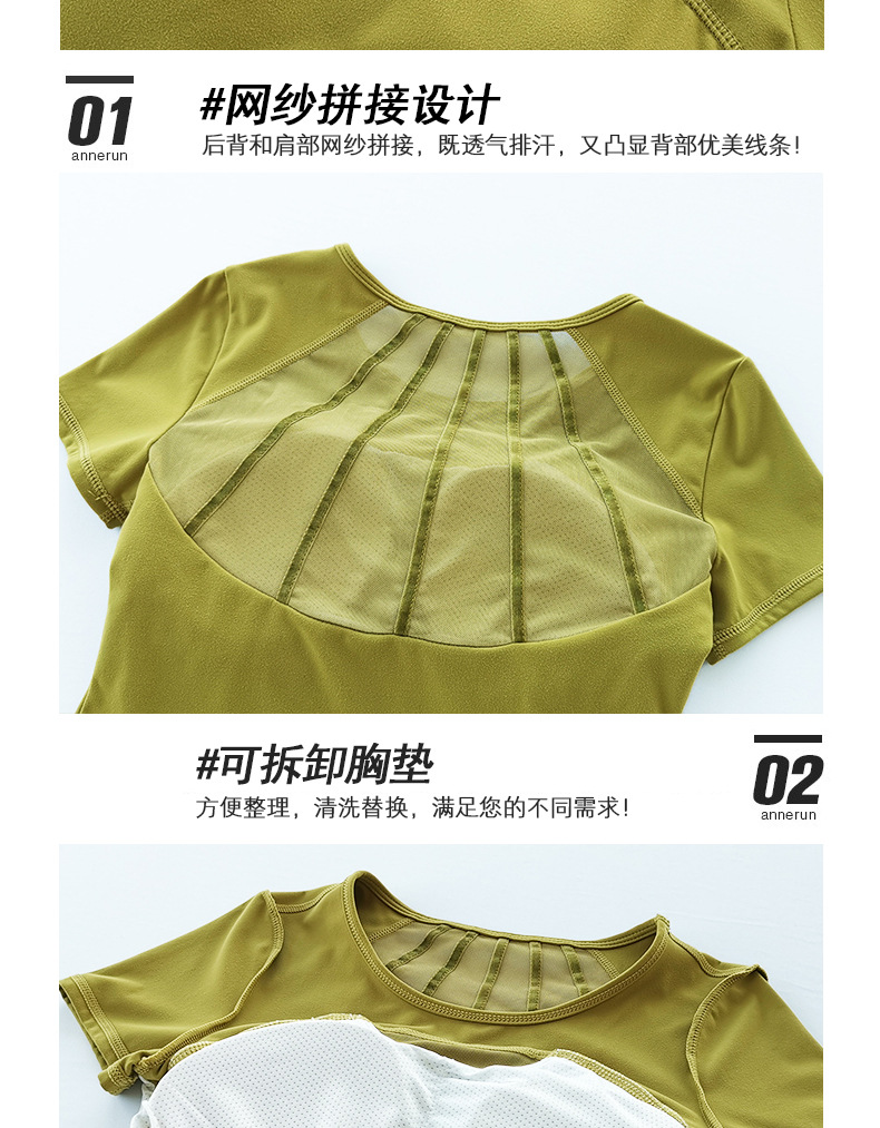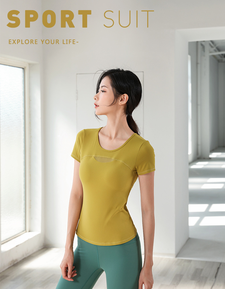 여성용 요가복 여름 신상 메쉬 패치워크 탈부착 가능한 반팔 티셔츠 스포츠 아웃도어 속건성 피트니스 상의