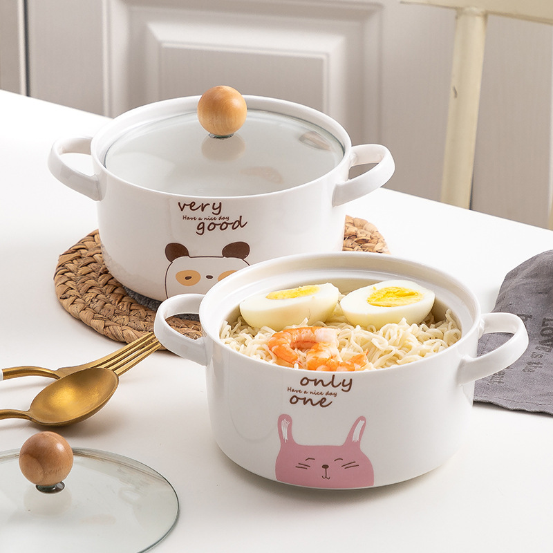 뚜껑이 있는 세라믹 만화 라면 그릇, 양쪽 손잡이가 있는 국그릇, 학생 기숙사용 국수/밥 그릇, 대형 식기, 인쇄 가능하고 귀여운 디자인스토어 가기