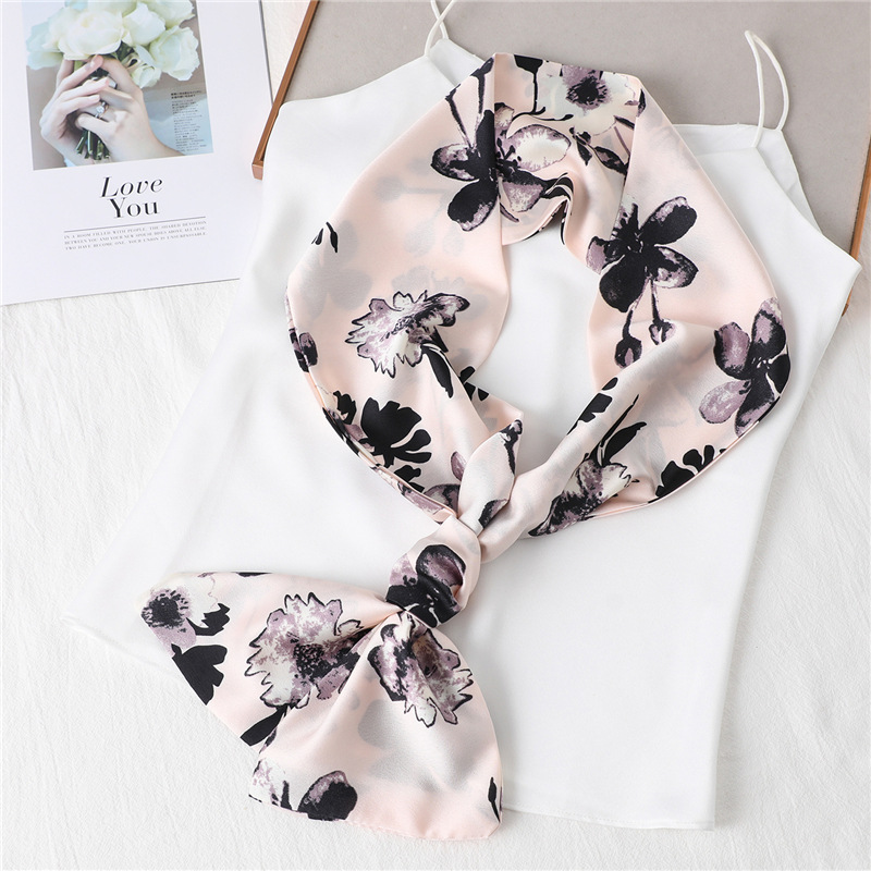 한국식 프린트 실크 스카프 여성용 롱 스퀘어 스카프 실크 같은 스카프 심플 엘레강트 플라워 더블 레이어 양면 전문 스카프 얇고 좁은