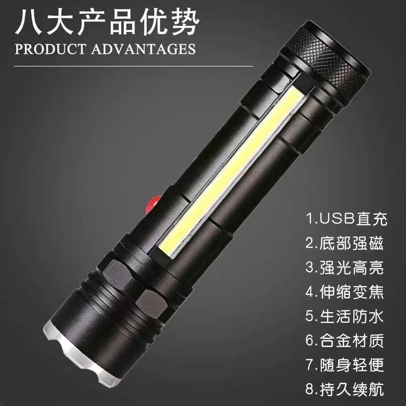 【特点】:头部T6灯强光-弱光--侧面COB灯强光-COB灯SOS 四功能 头部 T6灯带伸缩变焦功能,底部带磁铁