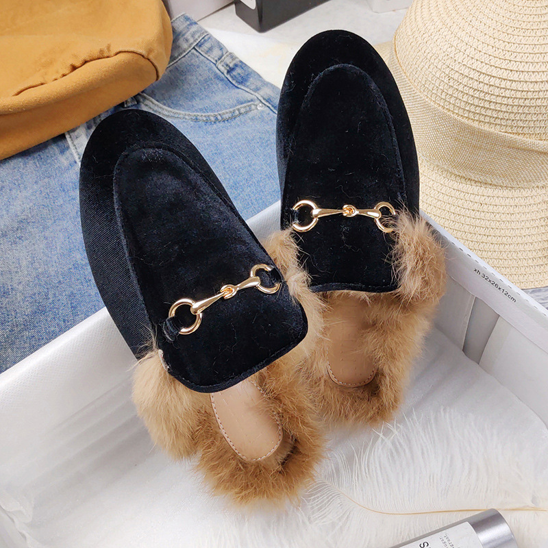 겨울 토끼 모피 기모 Baotou 하프 슬리퍼 여성용 모든 매치 플랫 게으른 아우터 뮬러 슈즈 플러스 사이즈 41-44 크로스 보더스토어 가기
