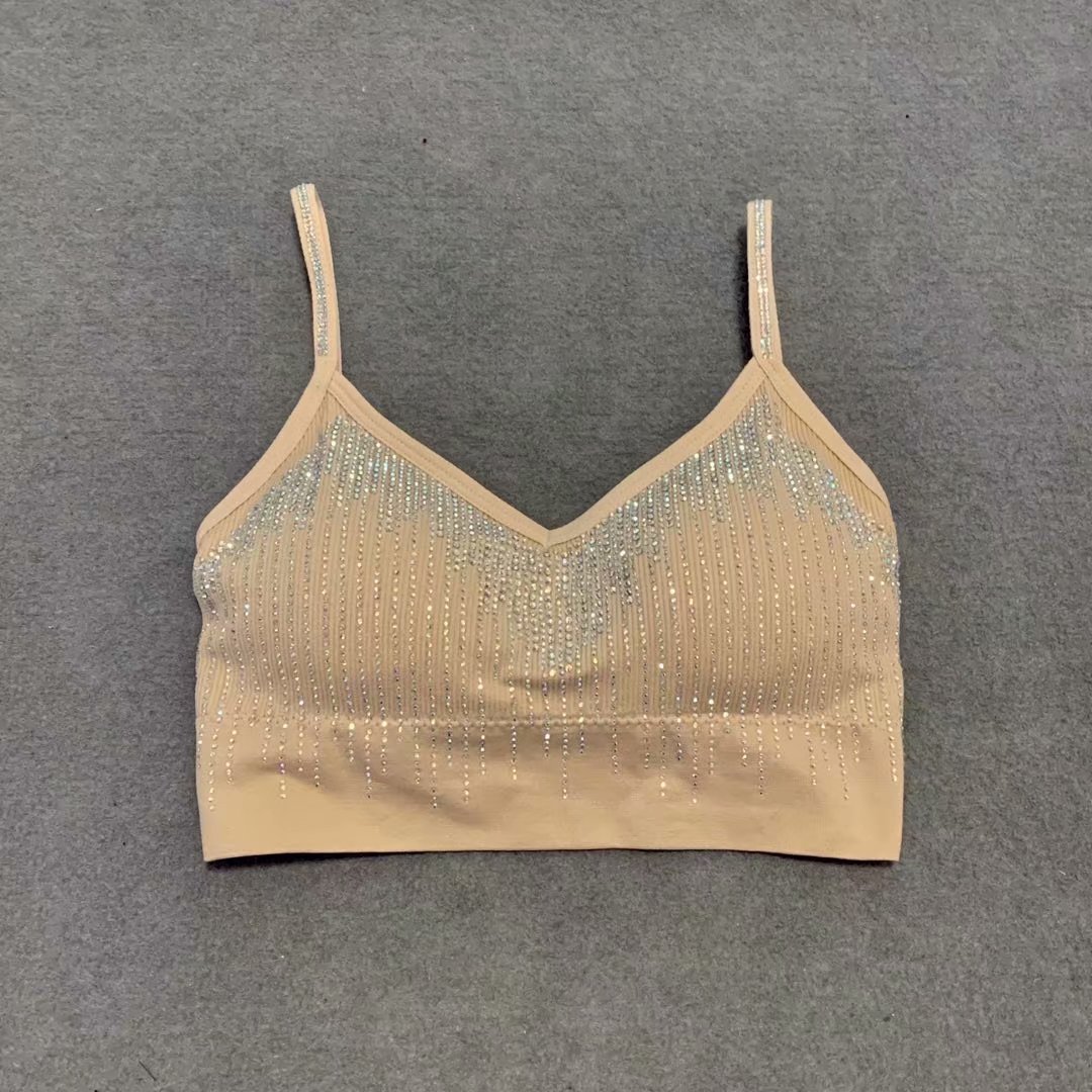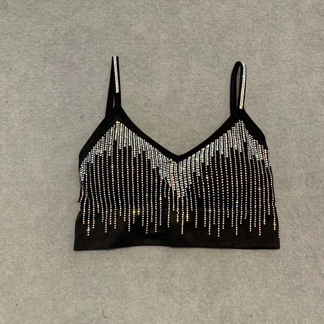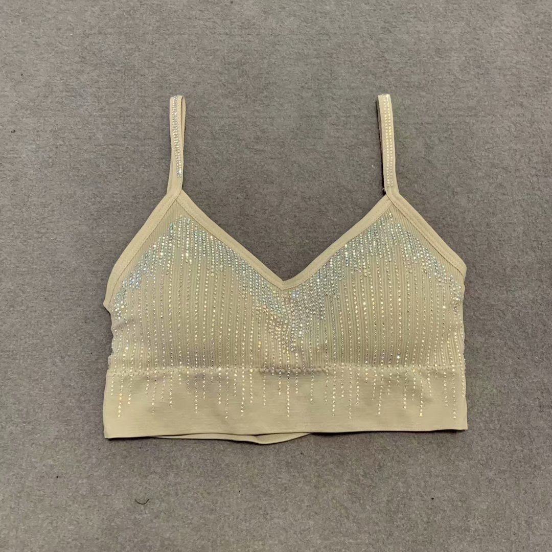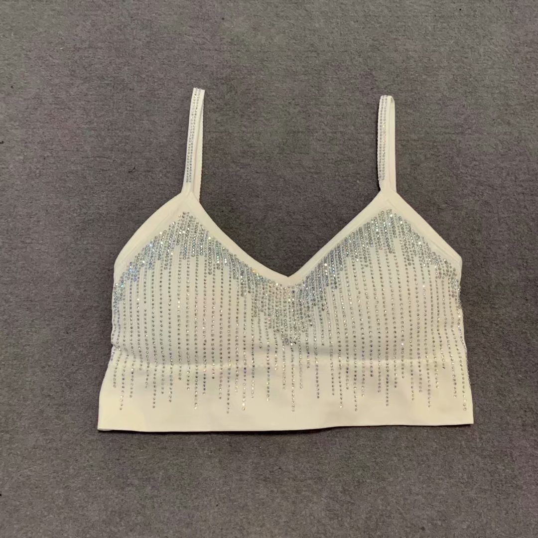 487 봄과 여름 신상품 다이아몬드 장식품 아름다운 등 짧은 작은 V-넥 얇은 어깨 끈 여성 단색 작은 조끼 가슴 포장스토어 가기