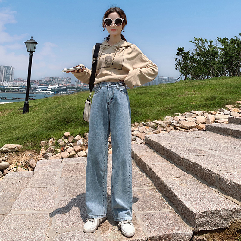 청바지 여성용 하이 웨이스트 슬림 와이드 레그 팬츠 2021 New Hyun-a 같은 스타일 걸레 바지 조절 가능한 허리 바지스토어 가기