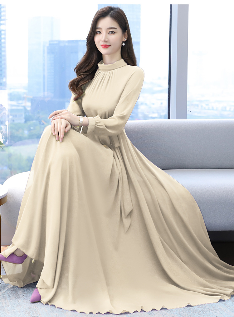 봄 2024 새로운 우아한 타이트 허리 슬림 핏 무릎 위 솔리드 컬러 쉬폰 긴 소매 원피스 비치 원피스