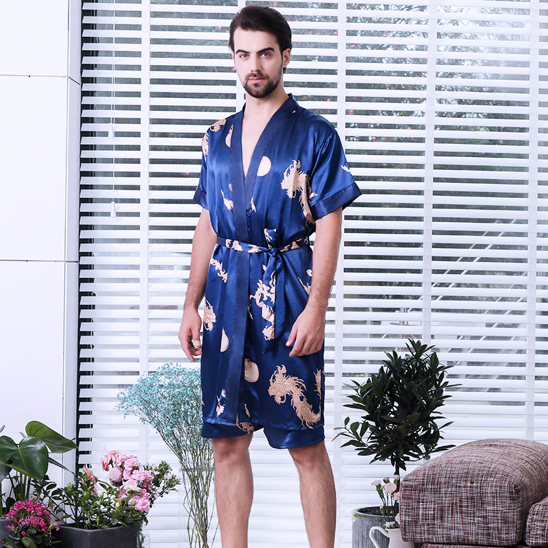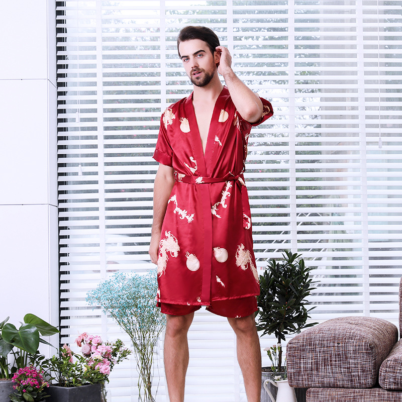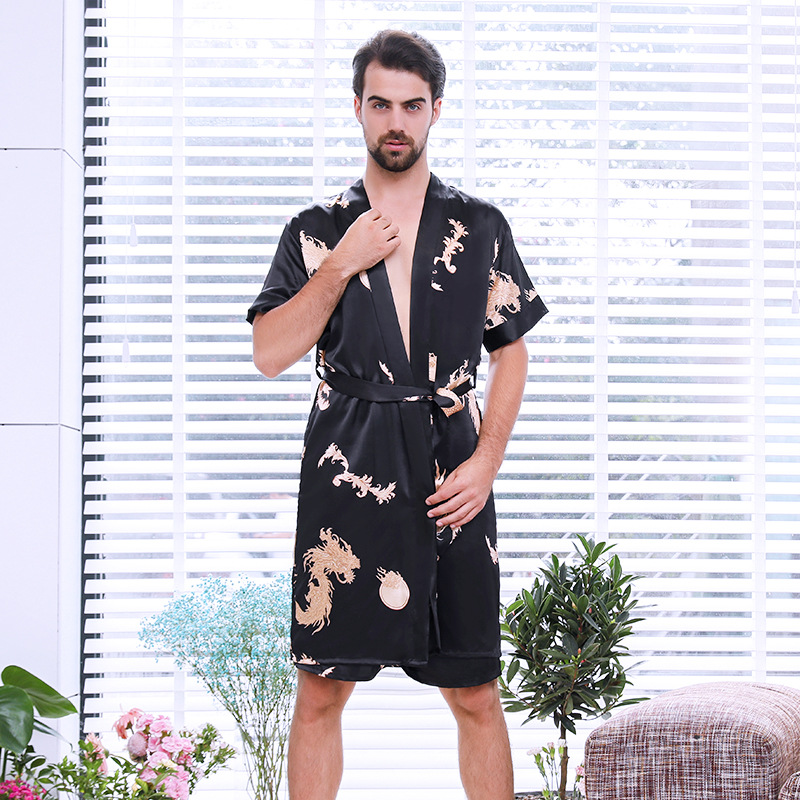 도매 남성 실크 잠옷 봄과 여름 얇은 카디건 반팔 고급 고귀한 목욕 가운 가정용 옷 머리카락의 세대