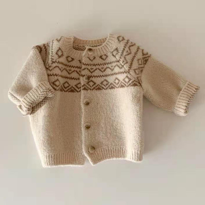 2022 한국 스타일 아기와 유아의 스웨터 코트 봄과 가을 모리 스타일 복고풍 패턴 라운드 넥 캐주얼 니트 스웨터