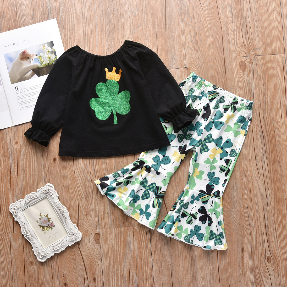 봄과 가을 성 패트릭의 날 소녀의 대외 무역 아동복 간단한 4 잎 클로버 인쇄 긴 소매 플래 바지 어린이 세트스토어 가기
