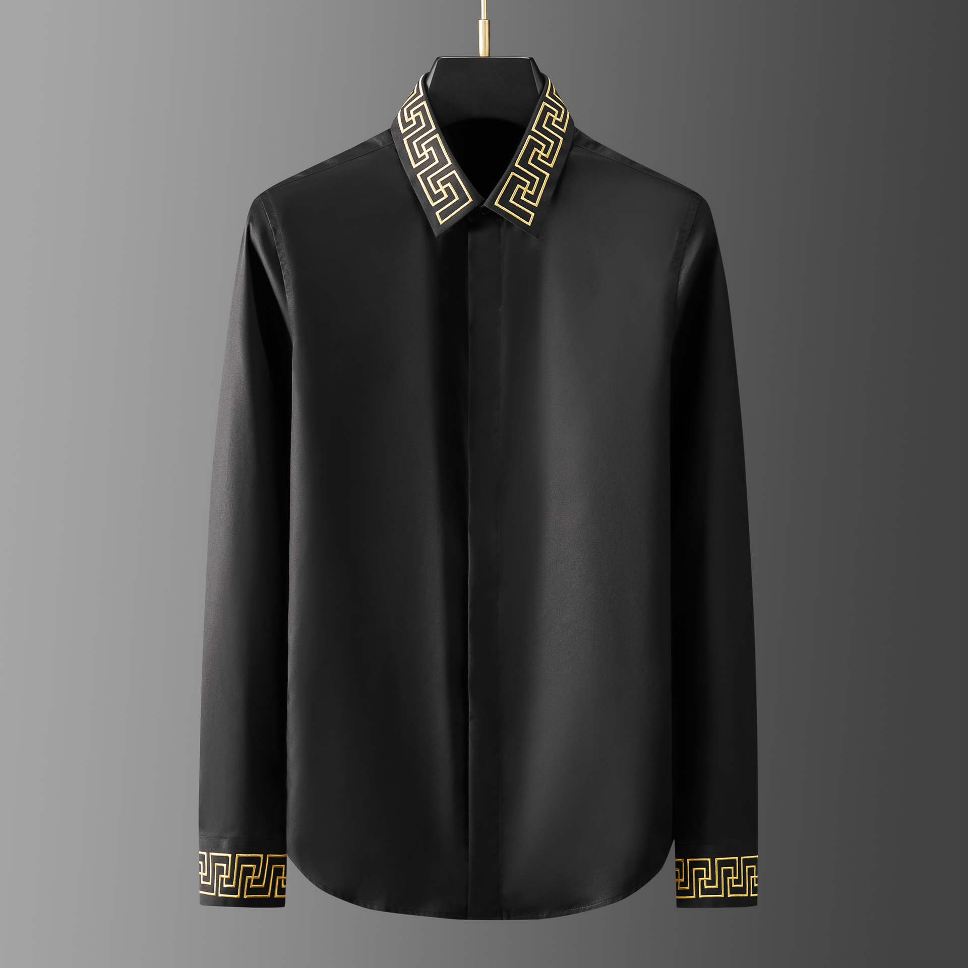 유럽 및 미국 패션쇼 트렌디 브랜드 칼라와 소매에 금자수 장식이 돋보이는 개성 있는 긴팔 흑백 슬림핏 남성 캐주얼 셔츠