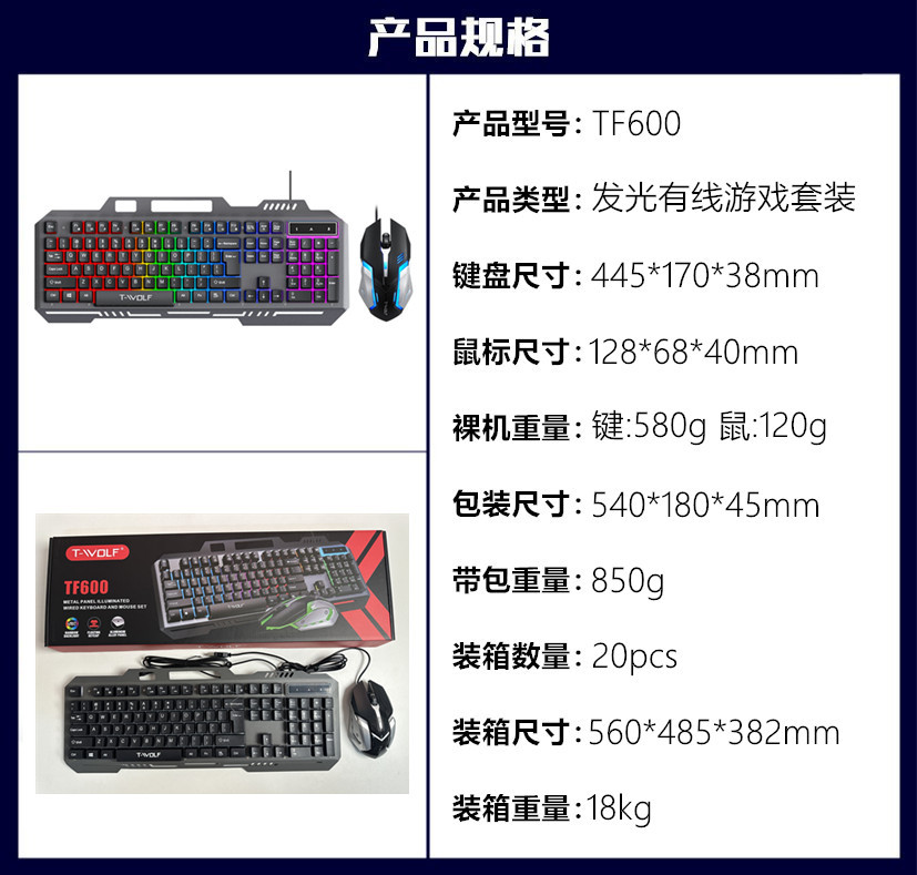 T-WOLF Thunder Wolf TF600 키보드 및 마우스 세트 유선 USB 발광 키보드 철판 강판 T16 키보드