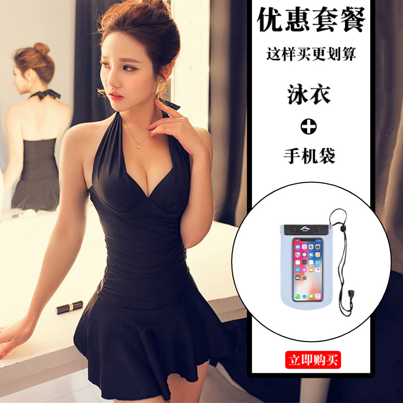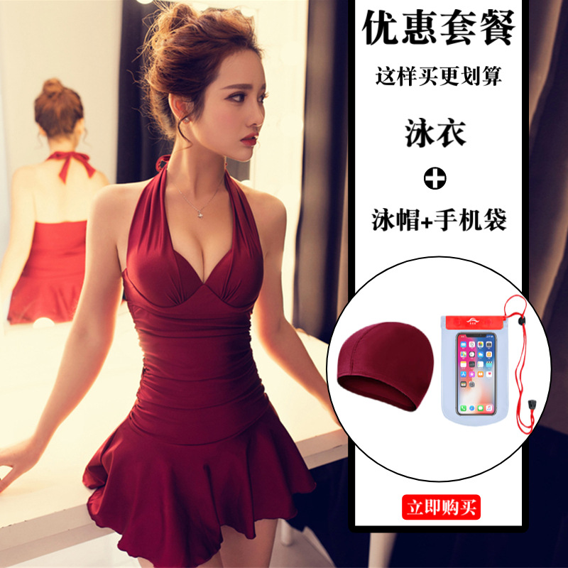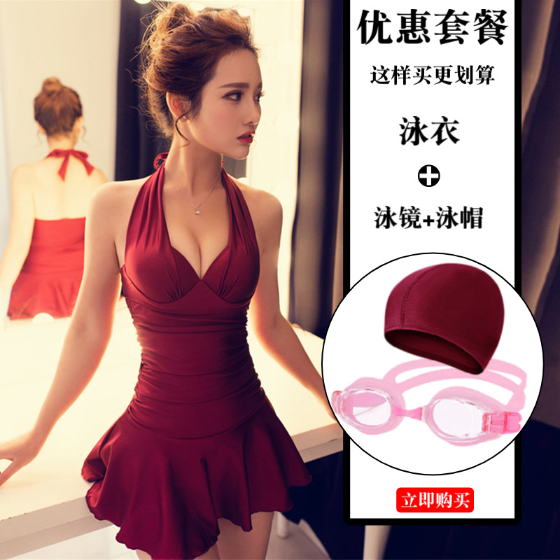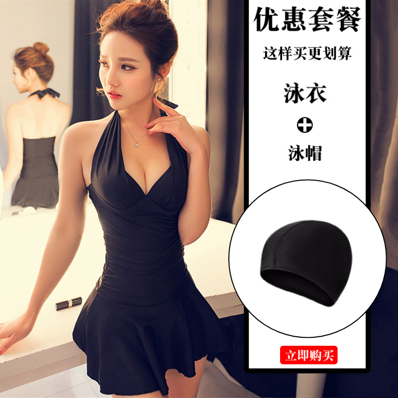 수영복 여성용 새로운 원피스 스커트 배꼽 커버 슬리밍 스틸 지원 작은 가슴 개더링 섹시한 단색 해변 온천 수영복