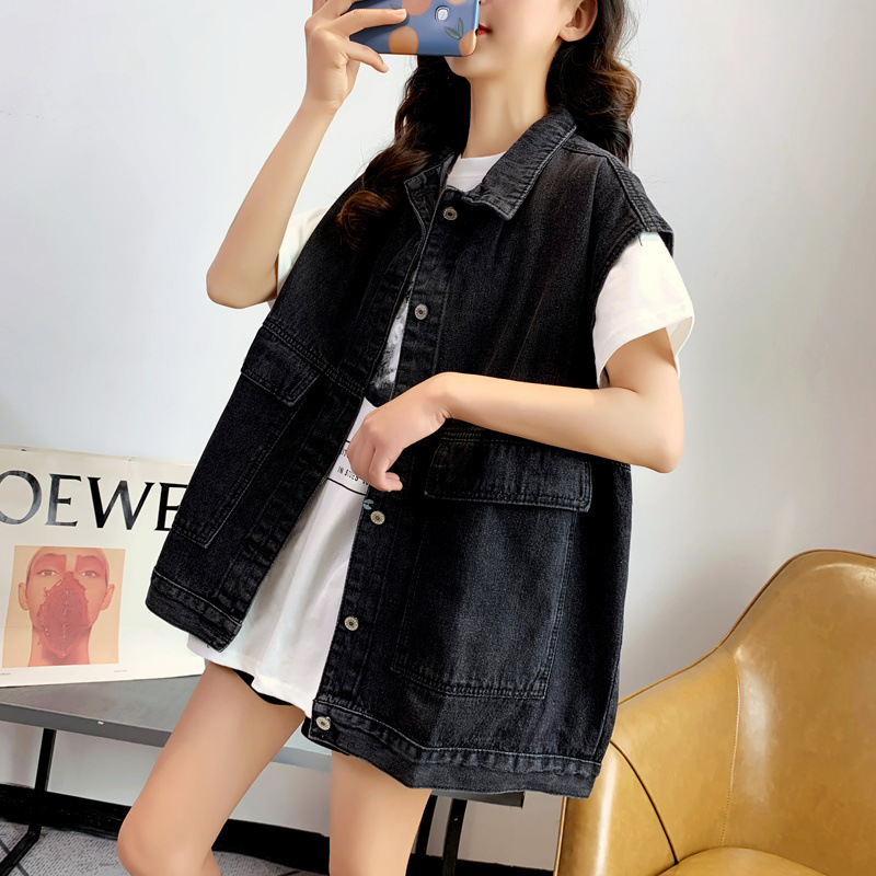 2024 봄 데님 조끼 여성의 새로운 한국 스타일 느슨한 양복 조끼 겉옷 학생 민소매 조끼 재킷 유행