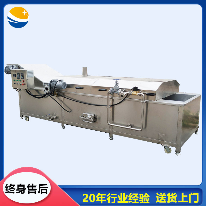 工作原理:蔬菜漂烫杀菌作业,在食品、饮料、制药等行业中,要求对一些包装完毕的产品进行水浴灭菌。被包装的产品放在可调速的不锈钢网带上,在传送带的作用下按序进人漂烫灭菌后,再有传送带带入冷却箱体内均匀冷却,从而达到产品杀菌要求。该系列设备连续运转,已灭菌的包装产品被源源不断送人下一生产工序。