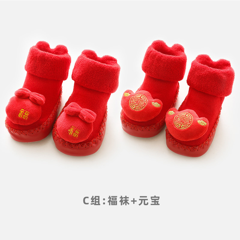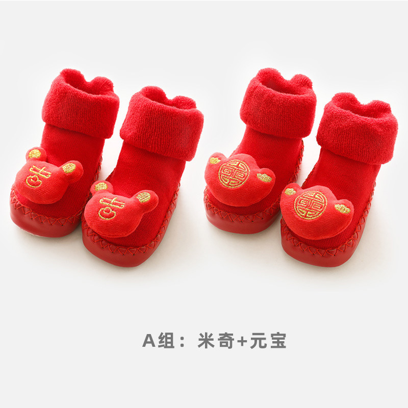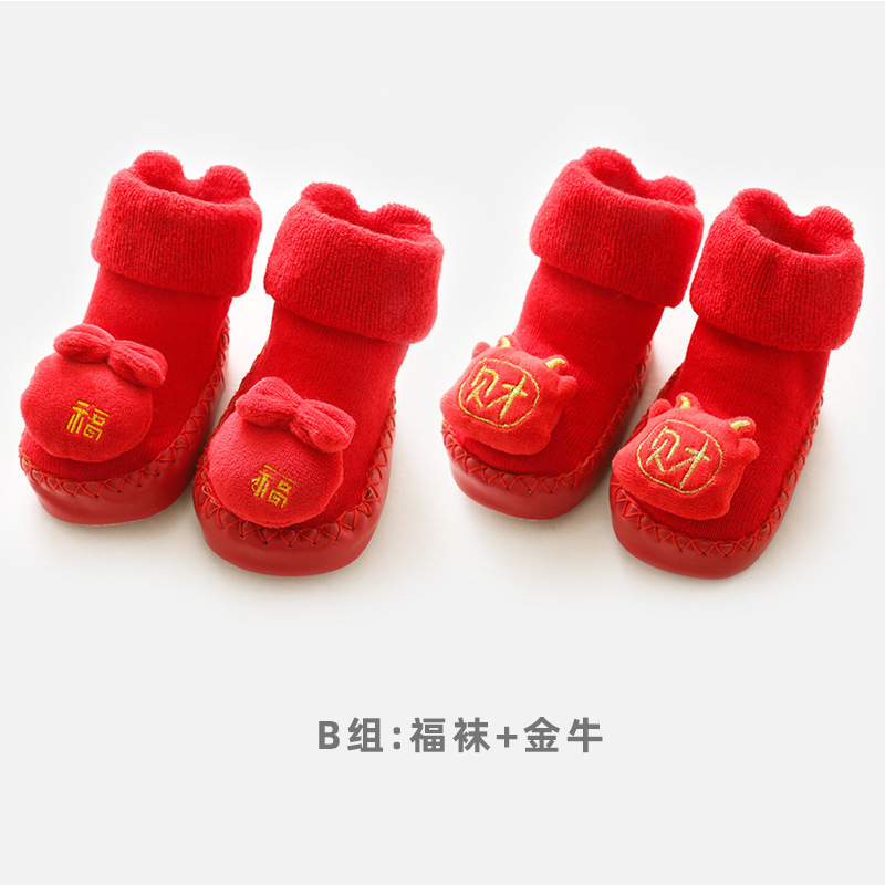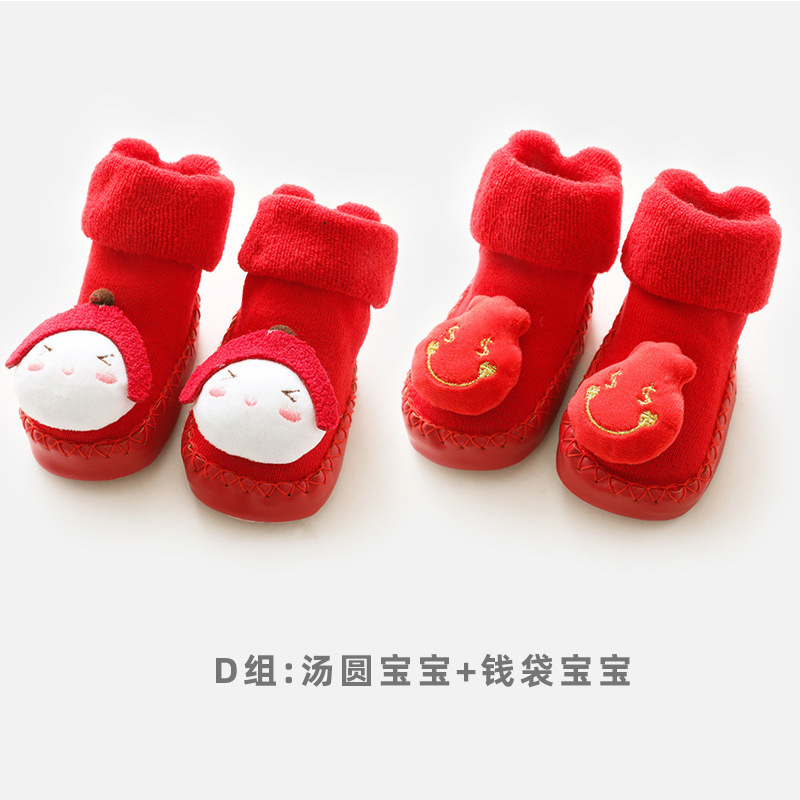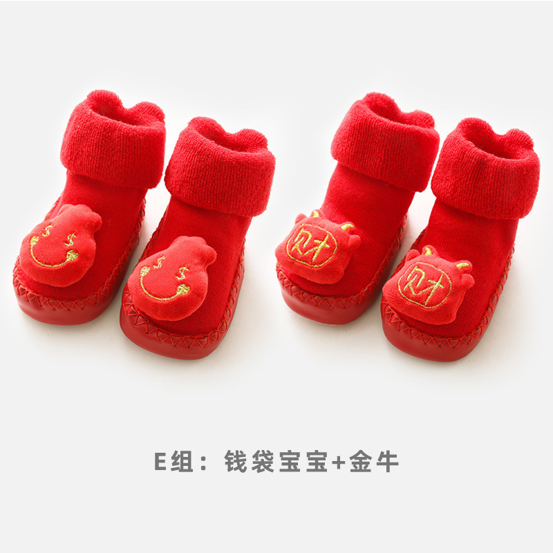 새해 빨간색 미끄럼 방지 가죽 신발 양말 가을과 겨울 새로운 테리 두꺼운 아기 신발 양말 아기 양말 2 쌍