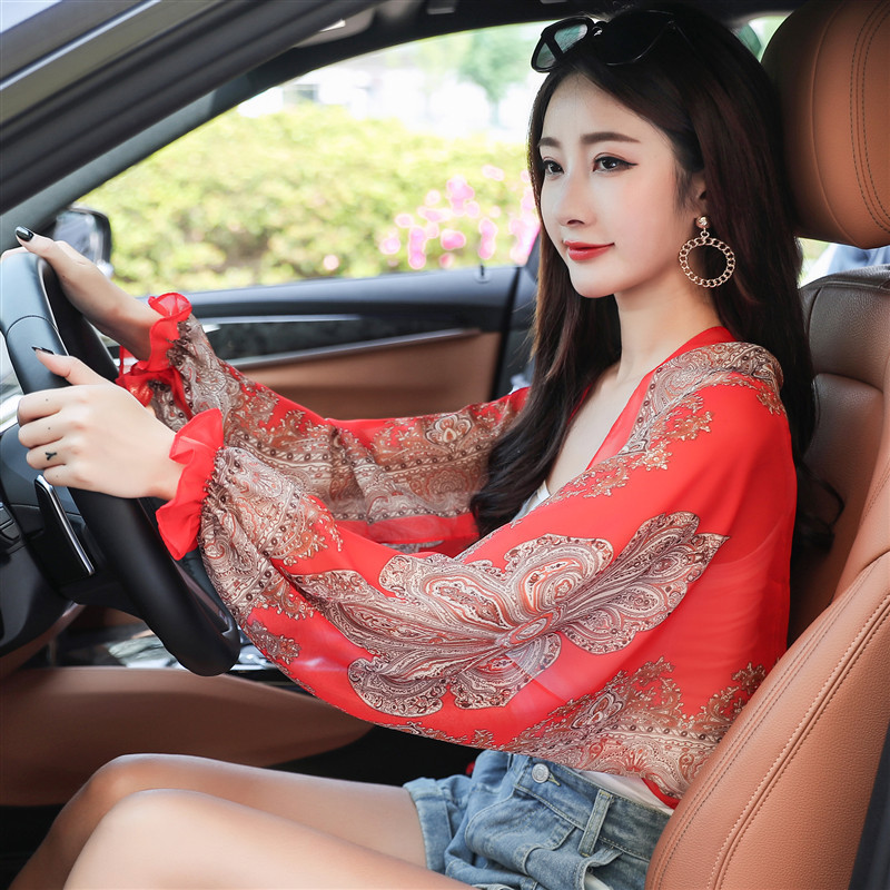 한국식 꽃 자외선 차단제 숄 여성용 유행 쉬폰 인쇄 야외 운전 얇은 모든 경기 슬리브 숄스토어 가기