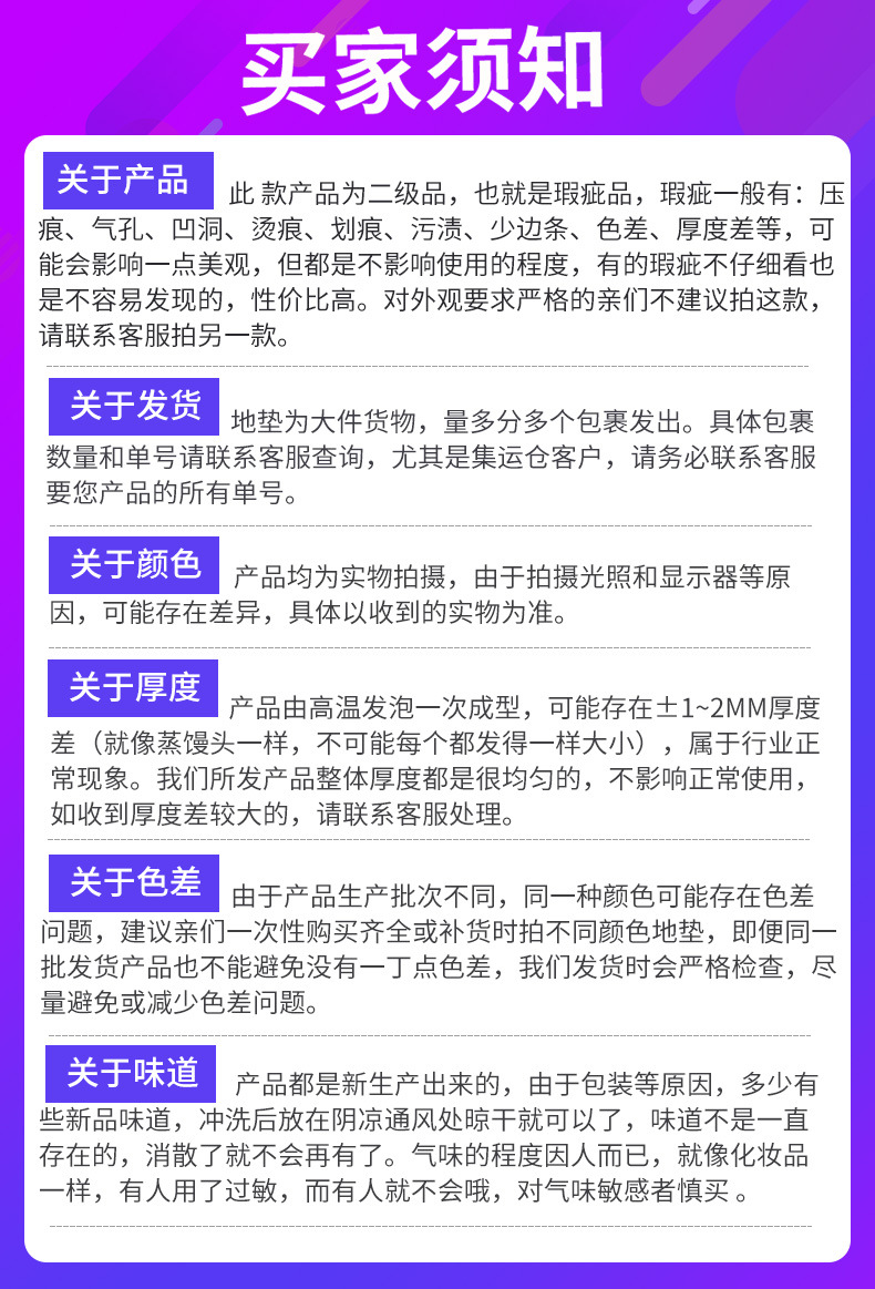 (4)提醒:此款产品为二级品,也就是瑕疵品,外贸订单挑出来的二级品,比内销品质的用料更好。二级品和一级品是同一批次生产出来的,二级品是从一级品里面挑出来的,瑕疵一般有:压痕、气孔、凹洞、烫痕、划痕、污渍、少边条、色差、厚度差、可消散新品味道等(包括但不限于以上问题),可能会影响一点美观,但都是不影响使用的程度,有的瑕疵不仔细看也是不容易发现的,性价比高,对外观要求严格的亲们家建议您购买咱们的一级品哦。