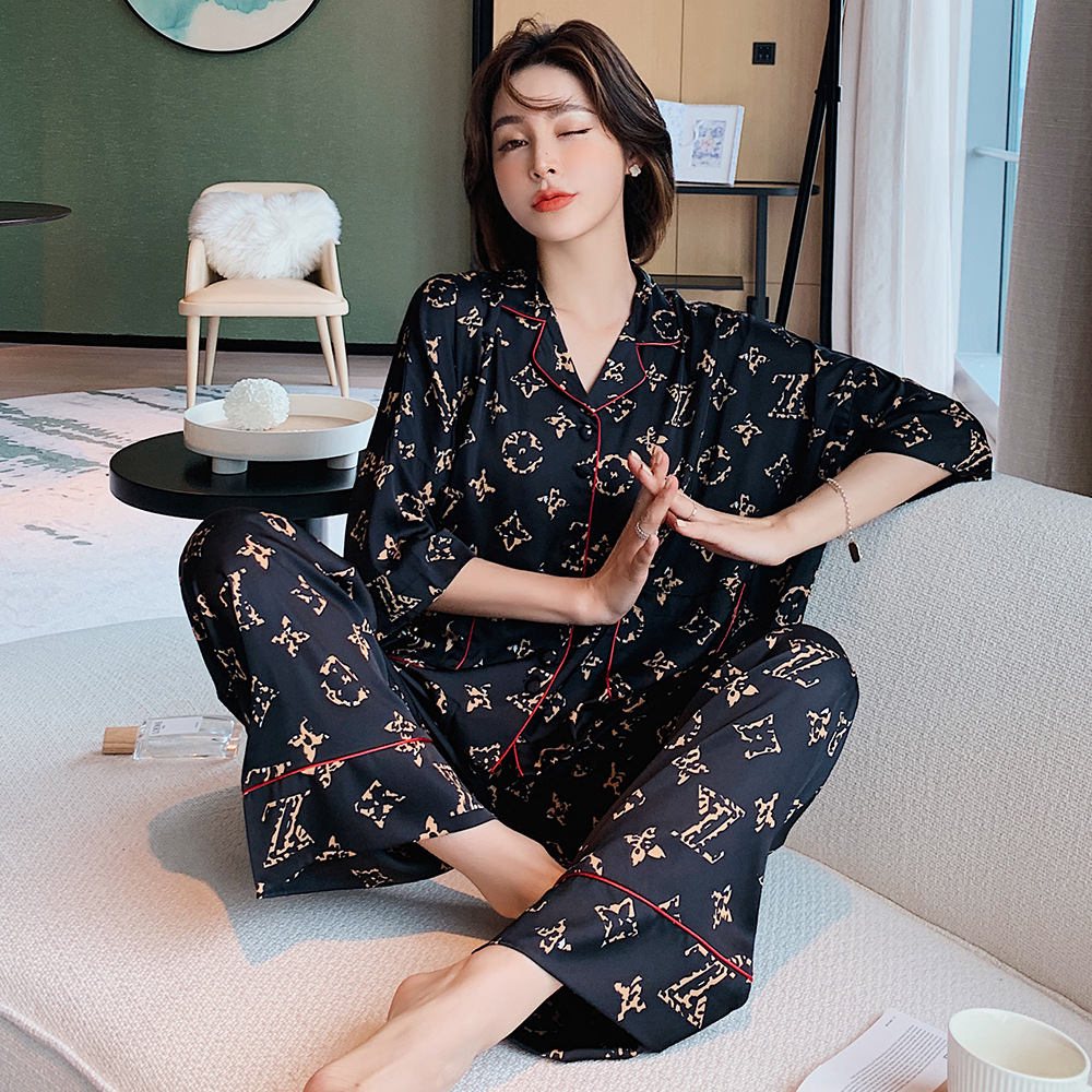 새로운 아이스 실크 잠옷 커플 TikTok Net 빨간색 트렌디 한 얇은 문자 남성 및 여성 세트 홈 착용 공장 직접 공급스토어 가기