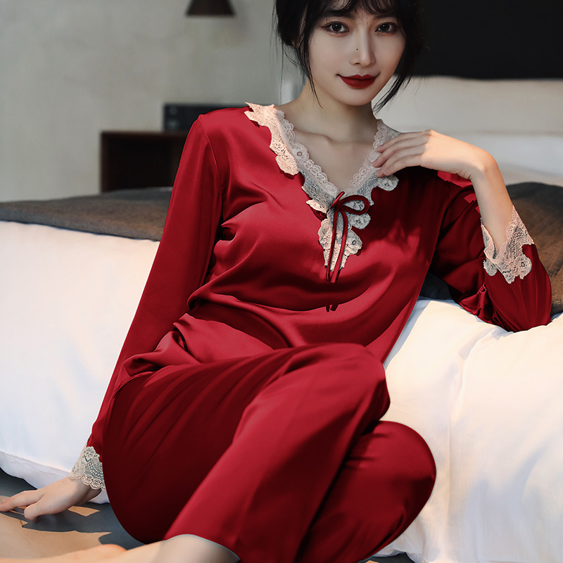 새로운 봄 여름 가을 얇은 실크 긴 소매 레이스 캐주얼 여성의 아이스 실크 가정 옷 풀오버 잠옷