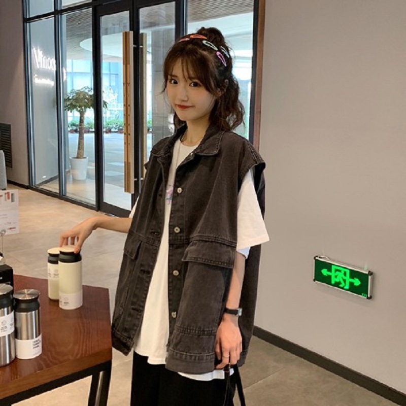 블랙 데님 조끼 코트 여성의 in 패션 티셔츠 조끼 조끼 여자의 겉옷 느슨한 한국 스타일 문학 빈티지